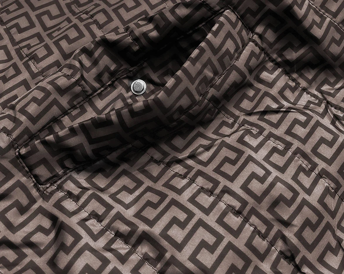 Bunda je lehce zateplená syntetickou péřovou výplní. Jedna strana bundy je hladká a druhá strana je lehce prošívaná. Model má kapuci, kterou je možné odepnout. V pase modelu jsou stahující šňůrky. Bunda má dvě kapsy. Kovové prvky mají stříbrnou barvu.