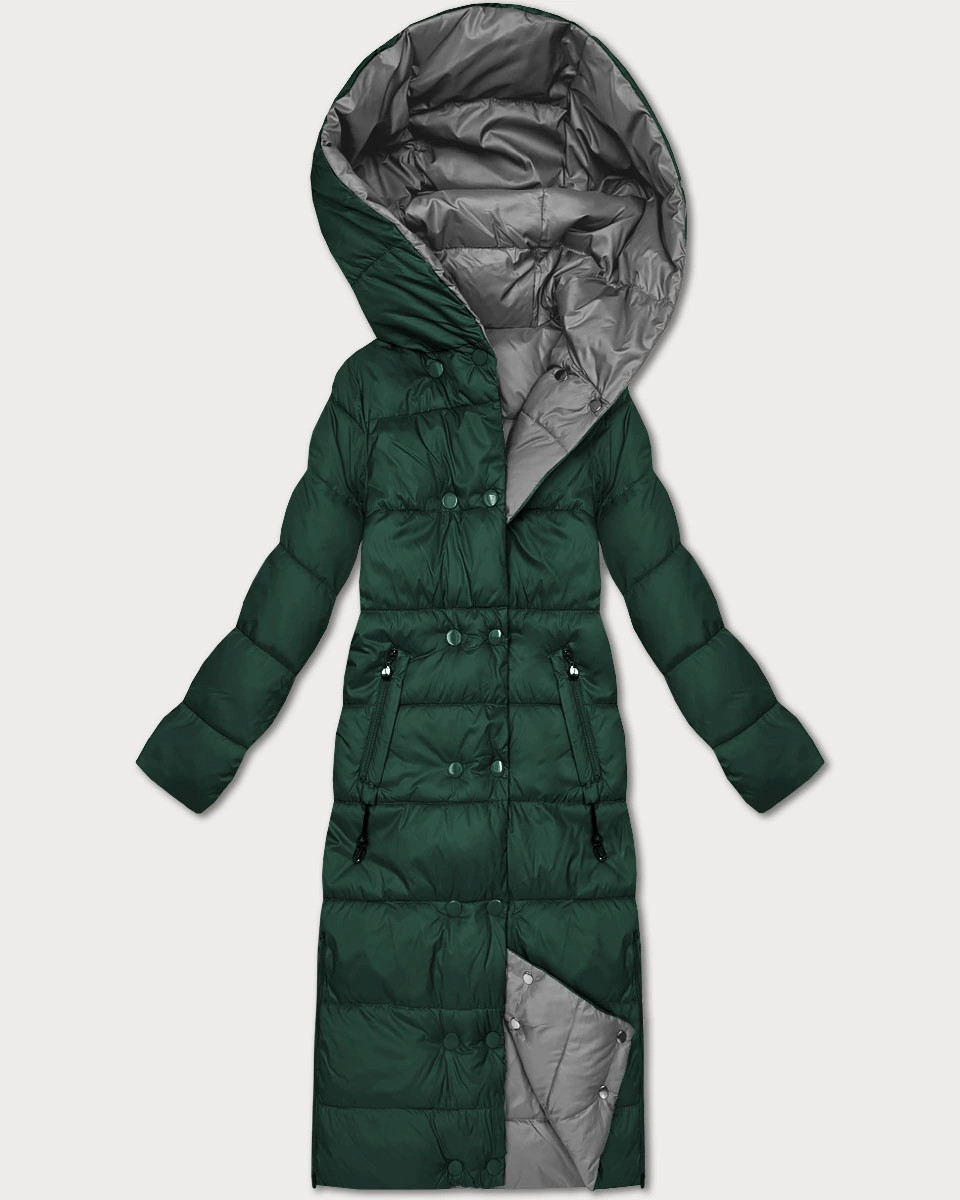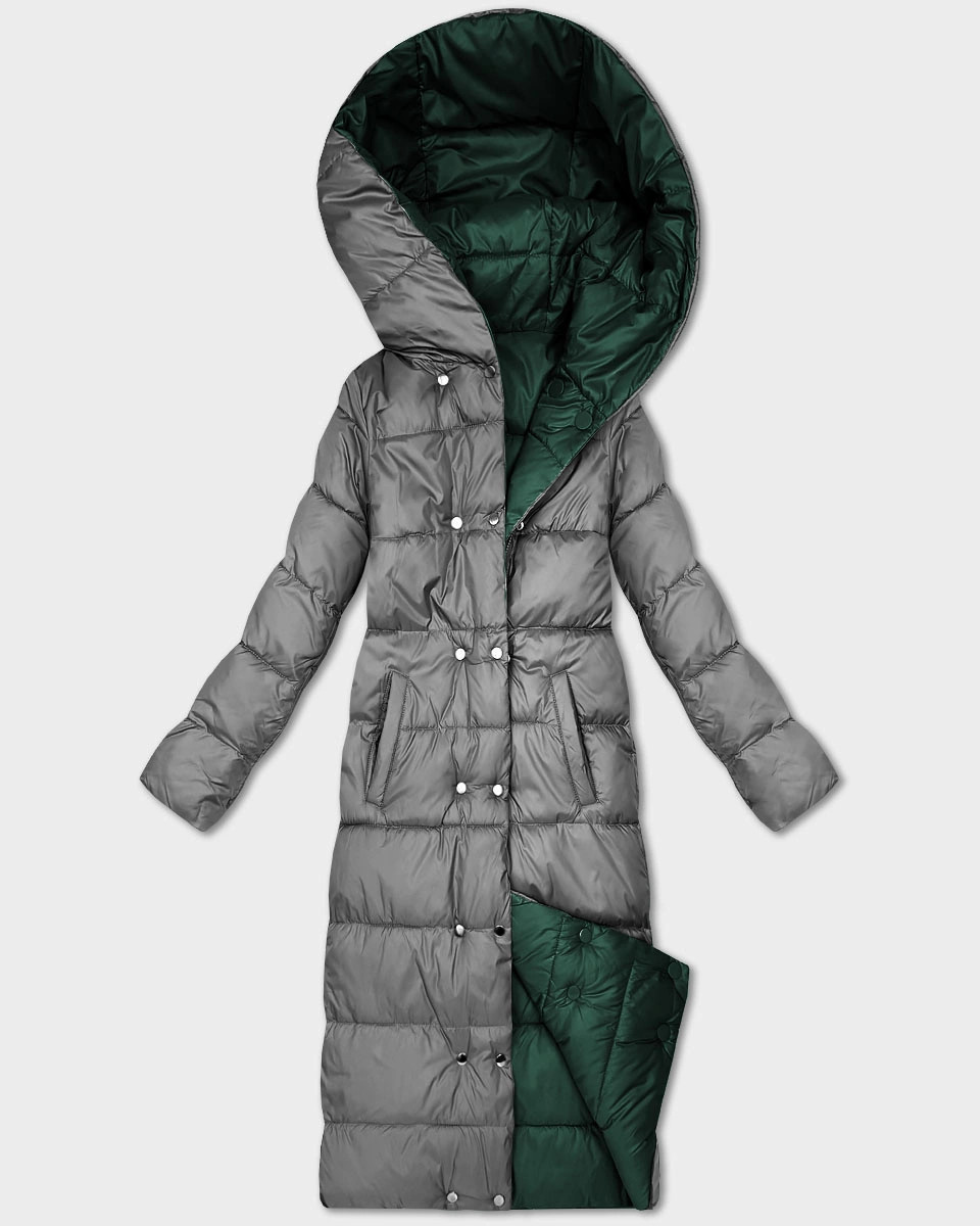 Tmavě zeleno-šedá oboustranná zimní bunda v délce ke kolenům Minority (P3-6017-33+61)