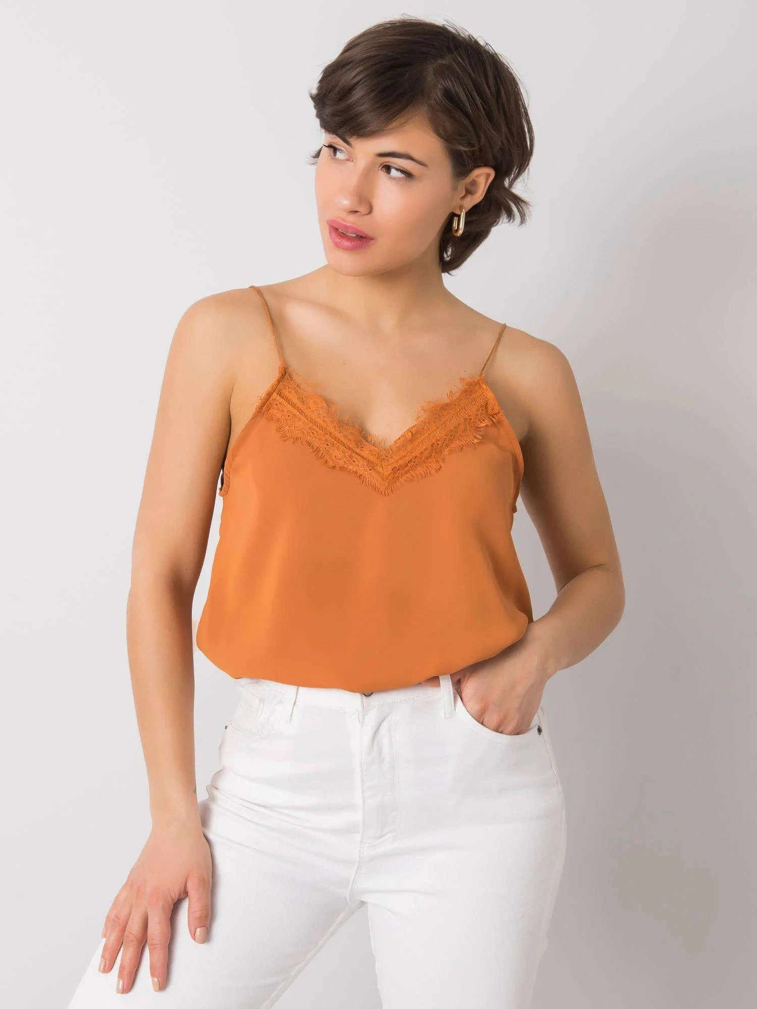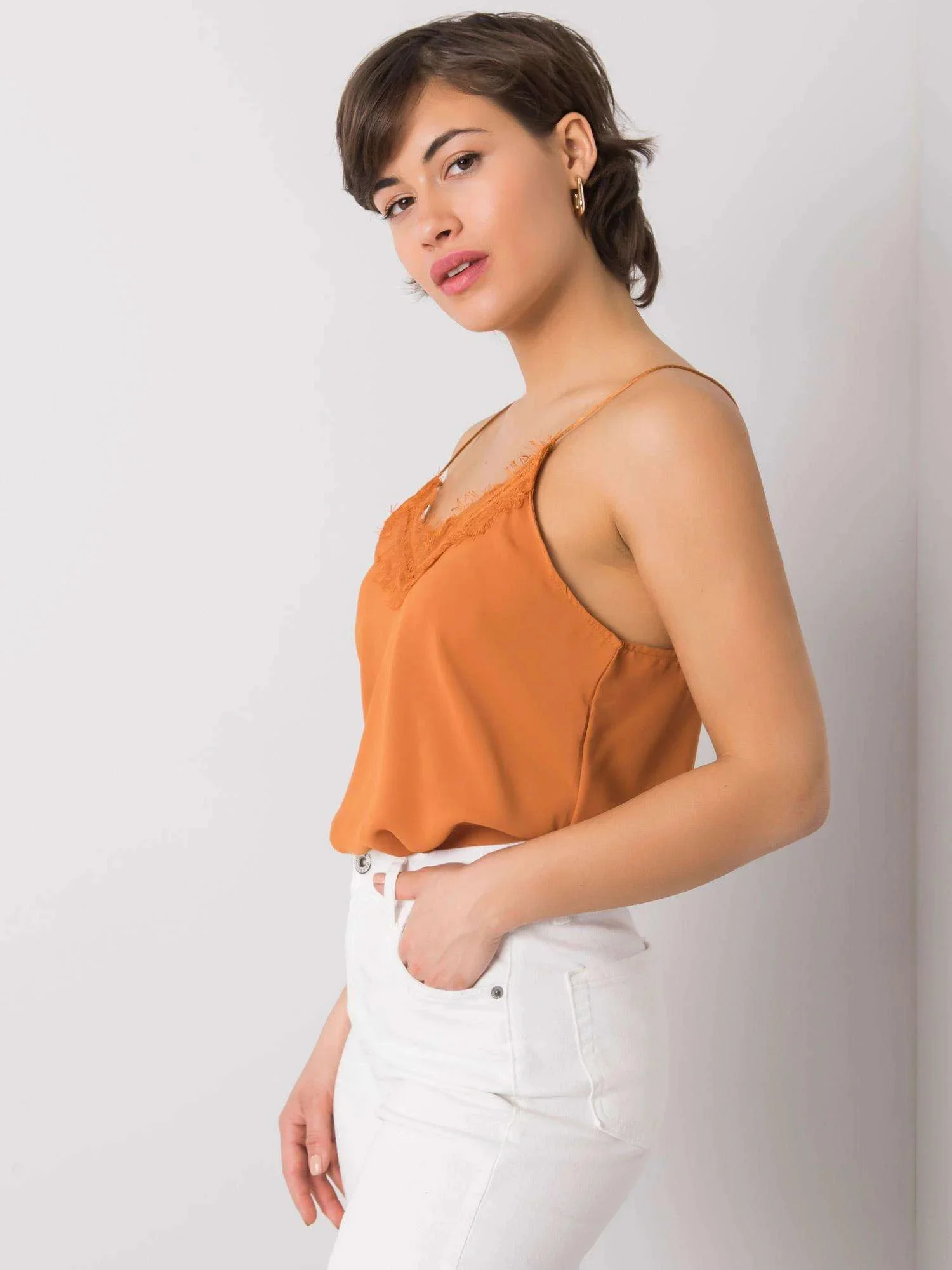 RUE PARIS Hnědý top s krajkou.