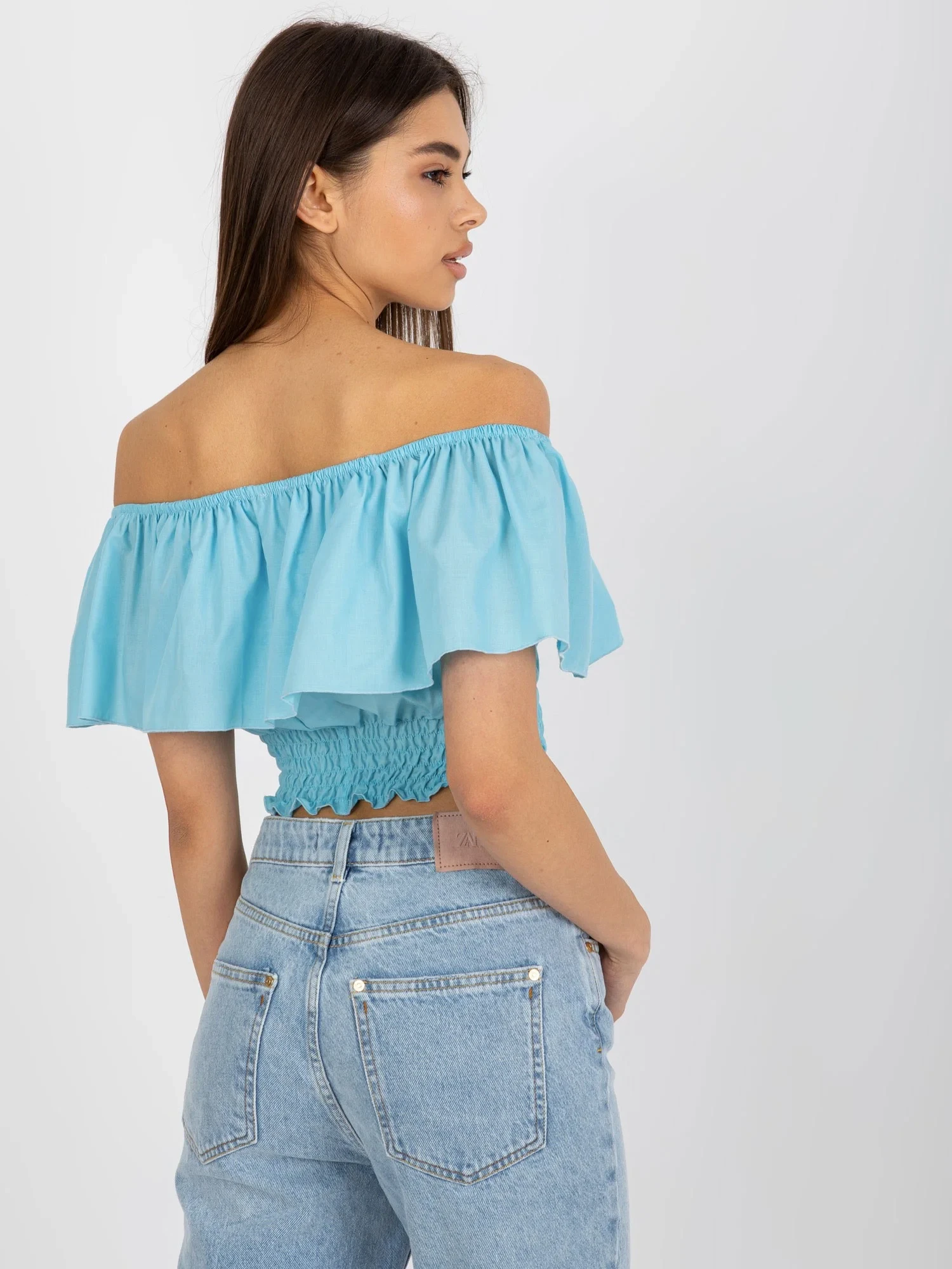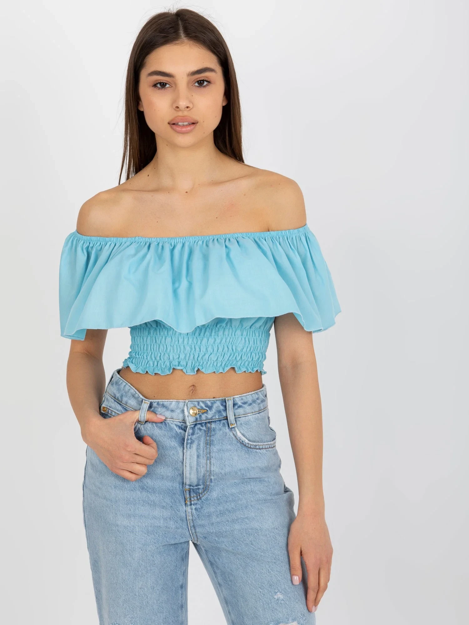 Světle modrá krátká pruhovaná halenka s volánkem .
