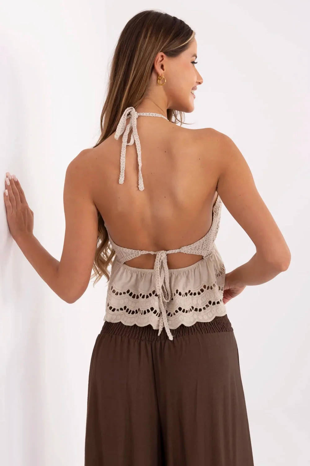 Stylový top v boho stylu, vyrobený z prodyšné, průsvitné pleteniny, která krásně podtrhuje letní charakter outfitu. Model s krátkou délkou a kulatým výstřihem, na jemných ramínkách, které se vážou jak na krku, tak na zádech, což umožňuje perfektní přizpůsobení topu postavě. Vsazené, zpevněné košíčky zajišťují pohodlí nošení a jemné podpírání poprsí, eliminují potřebu nošení podprsenky. Dominantním materiálem je přírodní bavlna s přídavkem elastanu, díky čemuž je top nejen příjemný na dotek, ale i elastický. Ideální k džínovým kraťasům, dlouhé sukní nebo volným kalhotám s vysokým pasem, must-have v letní garderobě.