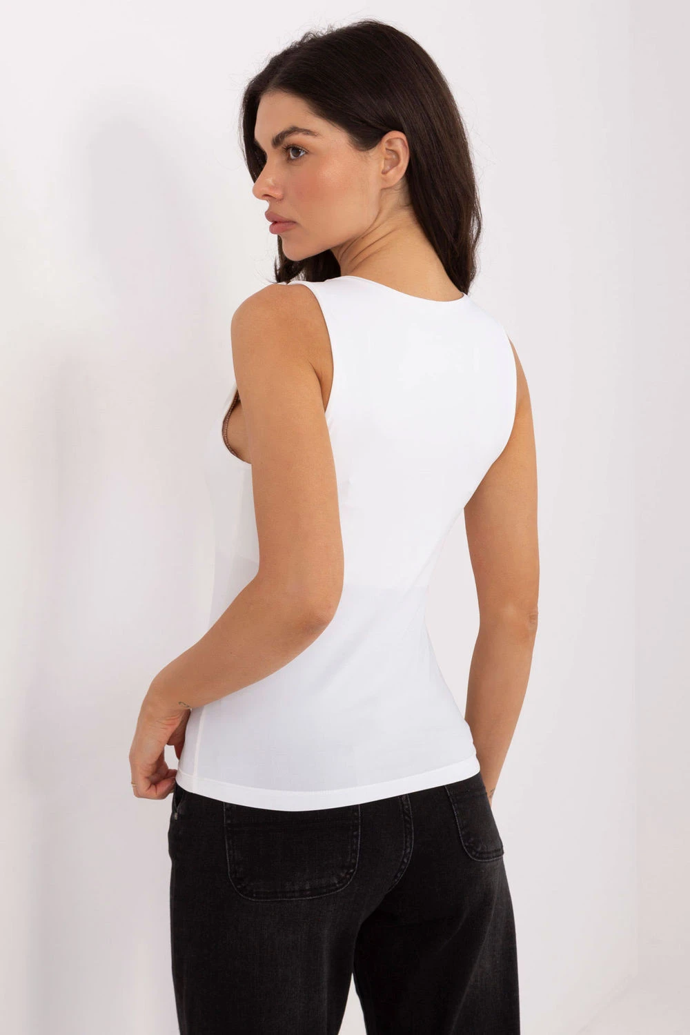 Tričko basic v casual stylu je univerzálním prvkem šatníku, ideálním na každý den a pro vrstvené outfit. Vyrobeno z elastické směsi polyamidu a elastanu, příjemně se přizpůsobuje tělu, poskytujíc pohodlí a volnost pohybu. Model s standardní délkou a bez rukávů se skvěle hodí do teplejších dnů nebo jako základ pod košile, mikiny nebo kardigany. Hladký vzor dodává minimalistický, nadčasový charakter. Celé dokončuje kulatý výstřih, který zdůrazňuje jednoduchý, klasický styl trička. Je to must-have v každé skříni.