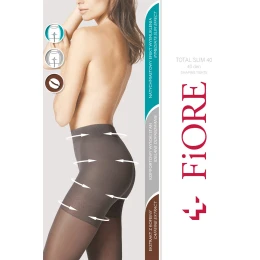 Punčochové zboží značky Fiore. Model Total Slim 40 den M5207. Výrobek je vyroben ze 79 % z polyamidu, 19 % z elastanu a 2 % z bavlny. Výrobek pro ženy. Tloušťka: 40 DEN. Žádné označené prsty. Označená sekce kalhotek.