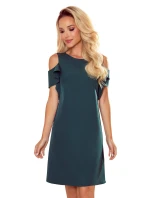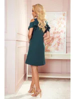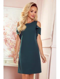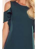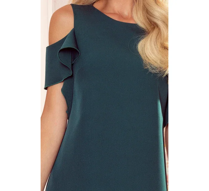 Trapézové dámské šaty v lahvově zelené barvě s volánky na ramenou 359-2