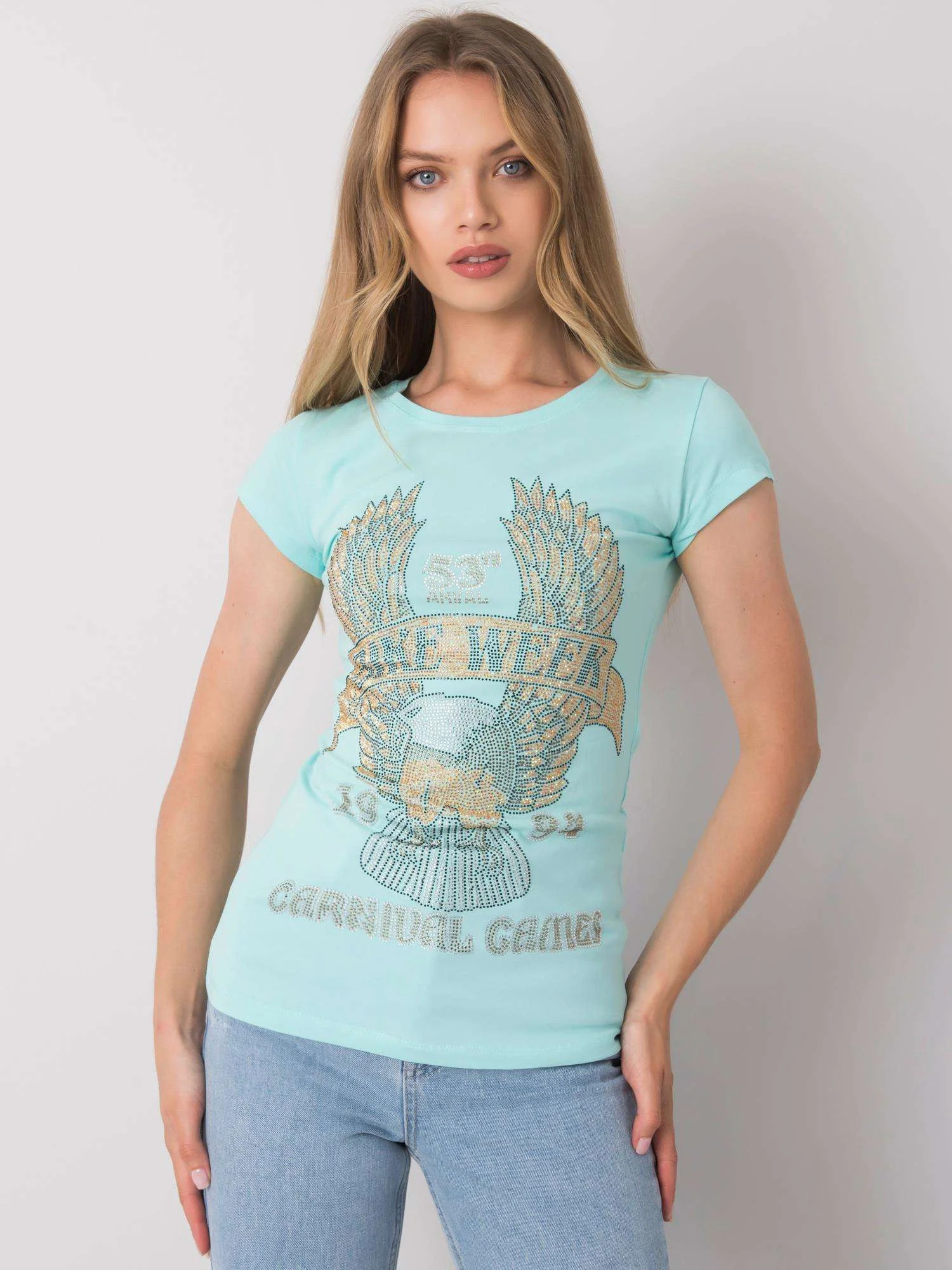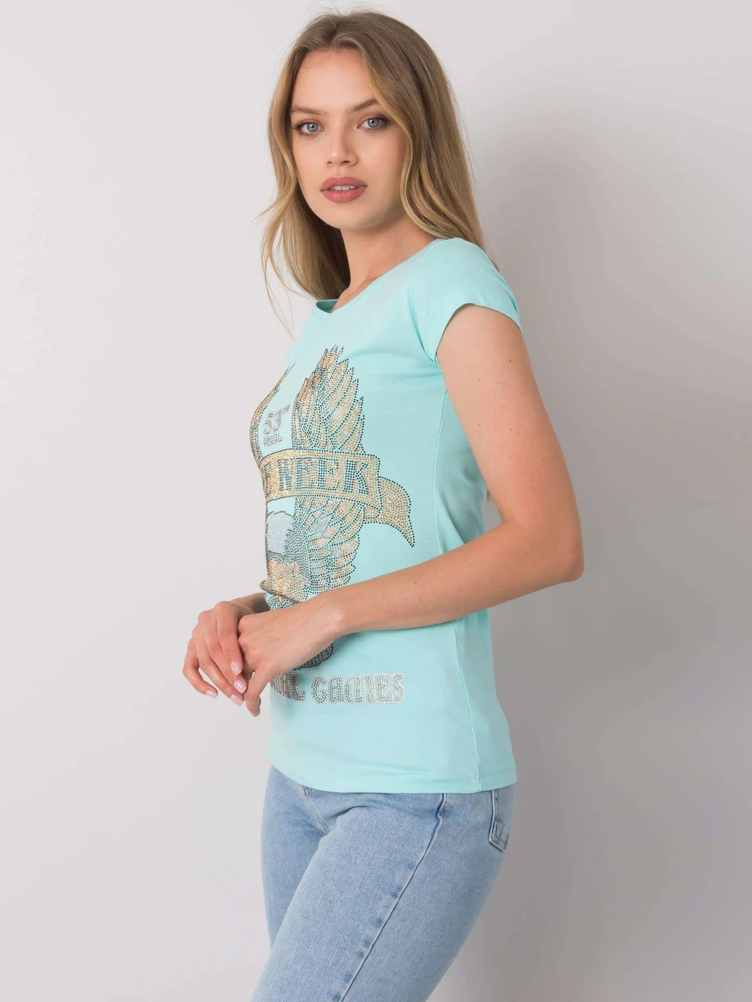 Světle modré dámské tričko s aplikací.