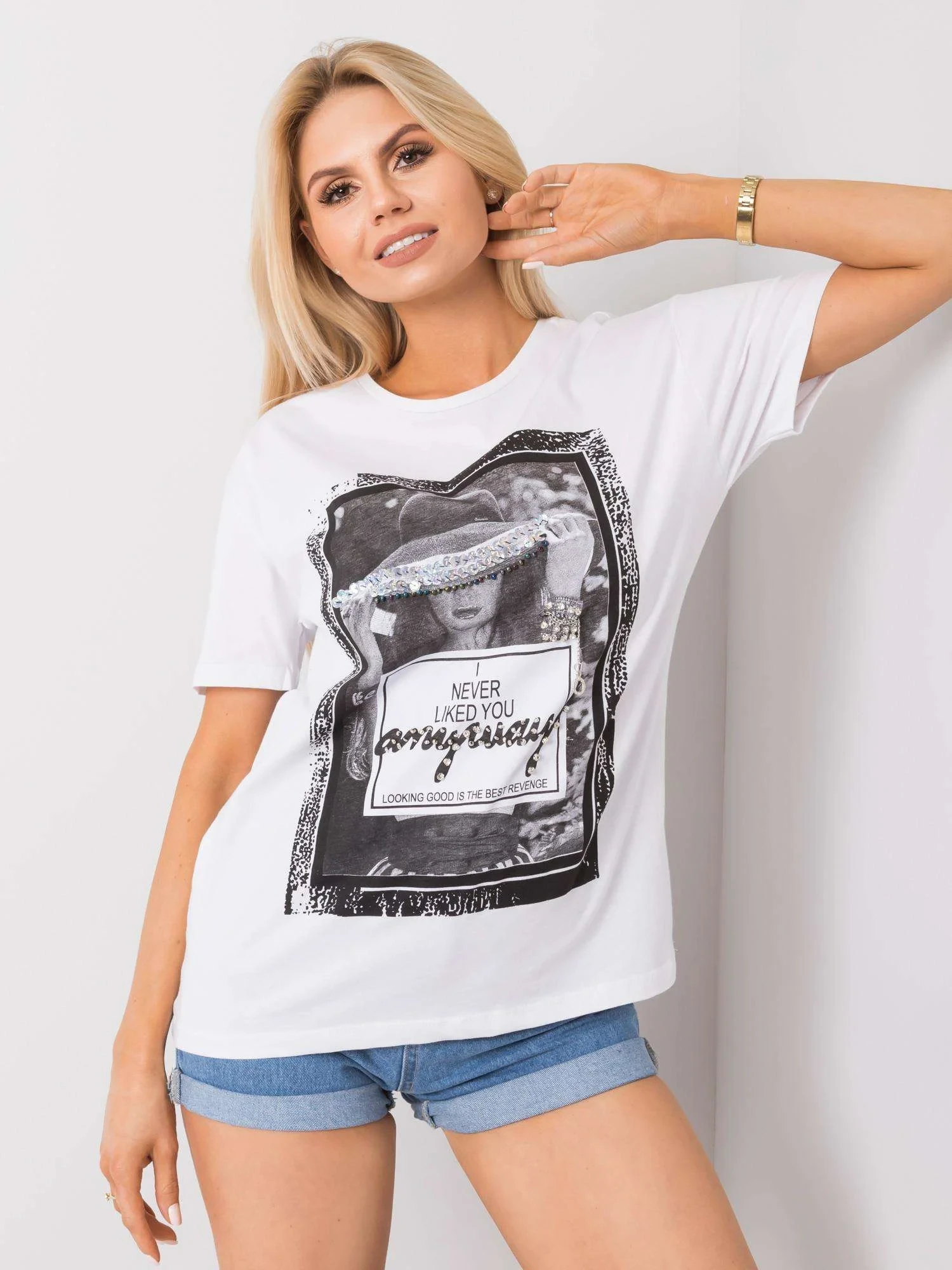 Bílé tričko s potiskem a aplikací.