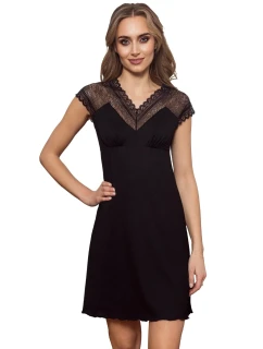 Černá noční košilka z řady Luna by Donna, která láká na krásnou krajku pokrytou výraznými modrými květy. Krajka jemně zdobí část košíčků, ramínka, také nádherně zvýrazňuje záda, navíc v této oblasti dodává jemný efekt průsvitu. Pohodlný střih, ve kterém se dokonale uvolníte. Výrobek balený v krabičce s hedvábným papírem uvnitř. 90 % viskóza, 5 % elastan, 5 % polyester.