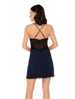 Jemná noční košilka z měkké viskózy v tmavě modré barvě. Košíčky zdobí krásná černá krajka, která svůdně zvýrazňuje dekolt. Prošívání pod poprsím. Vrchní profil v měkké konstrukci. Tričko má také lehce přiléhavý střih, který působí velmi žensky. Tenké nastavitelné ramenní popruhy. Linie stehen také s krajkovým akcentem. Složení: 94 % viskóza, 6 % elastan.