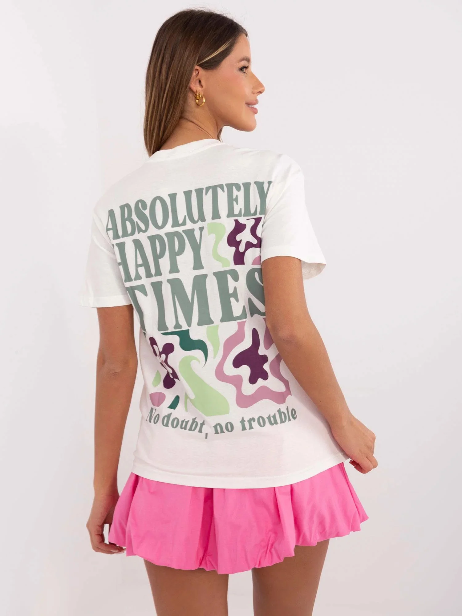 Rozměry trička ve velikosti S měřené na plocho: šířka v podpaží - 52 cm, délka rukávu - 21 cm (od švu), celková délka - 64 cm.
