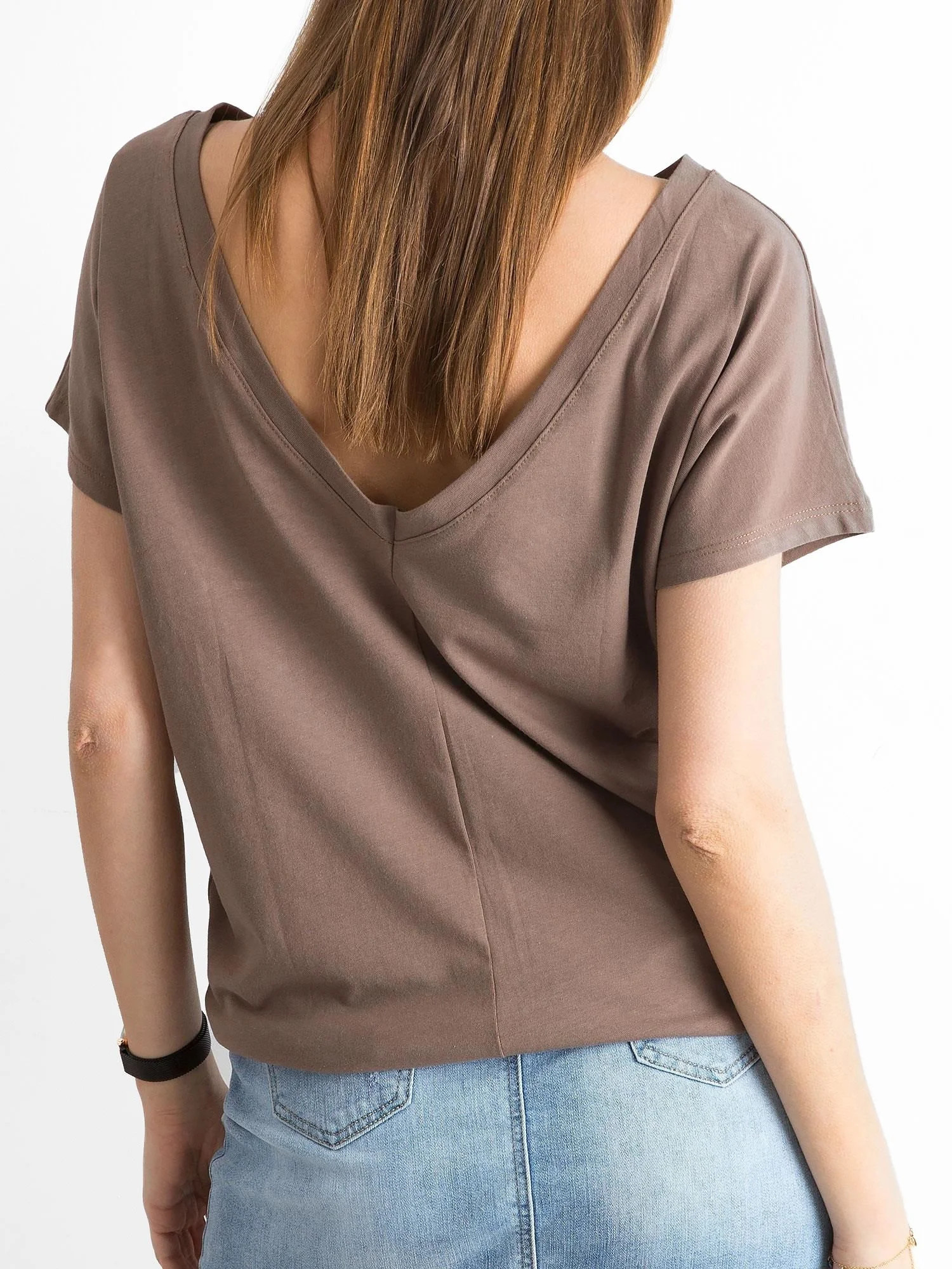 Brązowy t-shirt Fire. Klasyka jest zdecydowanie najbardziej ceniona w modzie, więc koszulki w stylu basic zasługują na szczególną uwagę. Dzięki nim bez wysiłku zbudujesz modne stylizacje na co dzień, a także na różnego rodzaju imprezy niewymagające oficjalnej oprawy. Sprawdzą się one w niemal każdej sytuacji, w której rządzi niczym nieskrępowany casual. Do pracy, do szkoły, na uczelnię - damski t-shirt basic założysz bez problemu na te okazje. Są one świetną bazą do tworzenia różnych strojów o charakterze sportowym, miejskim lub eleganckim. Wystarczy dobrać do nich odpowiednie dodatki oraz założyć pozostałe ubrania w danym stylu żeby cieszyć się oryginalną i modną stylizacją. Ten t-shirt damski basic został stworzony specjalnie z myślą o kobietach lubiących nieco szykowniejsze stylizacje, ale w wygodnym stylu. Finezyjny dekolt na plecach w kształcie dużego trójkąta dodaje mu niesamowitego pazura, a wysokiej jakości materiał zapewnia wygodę oraz prawdziwą p