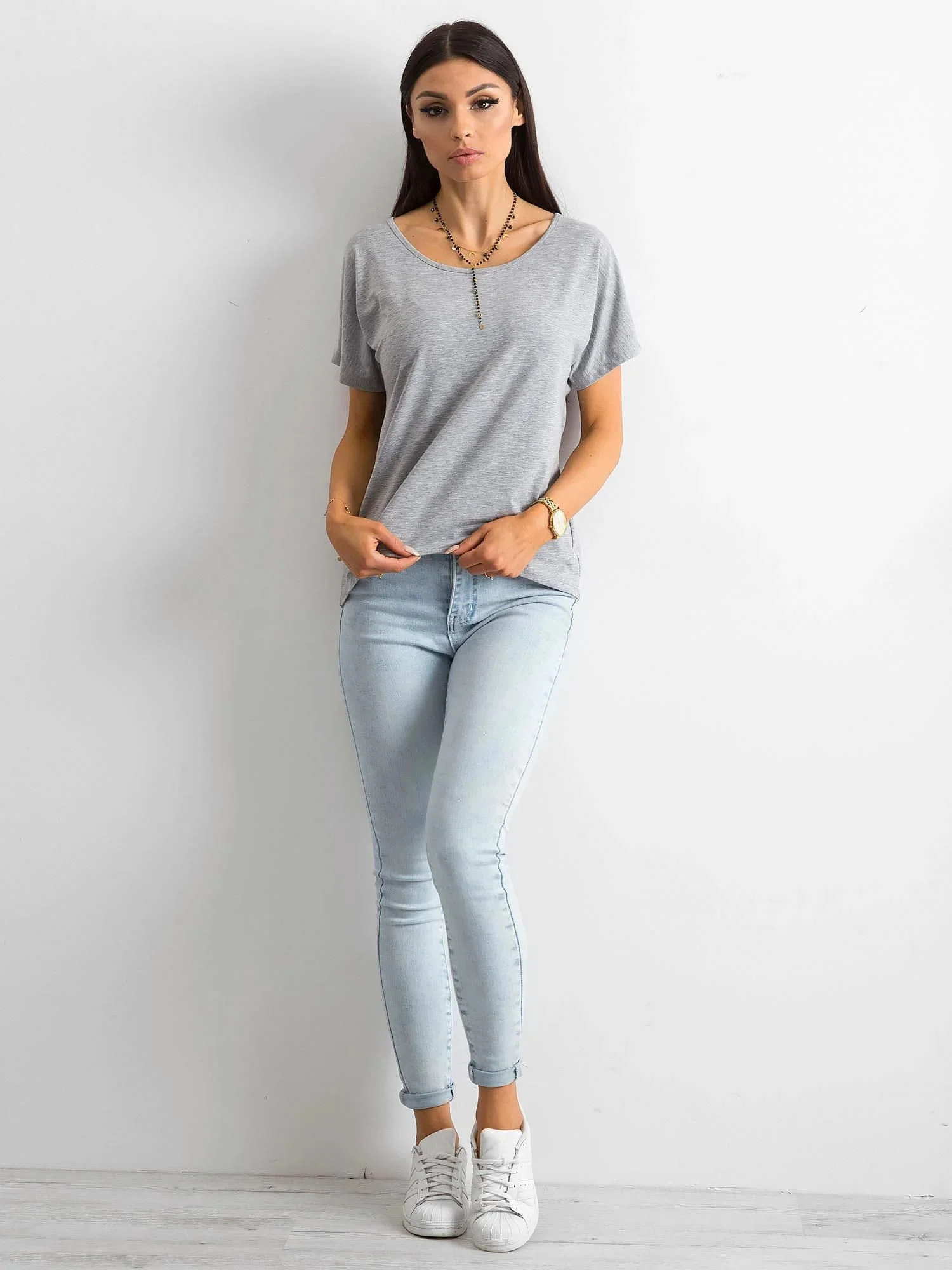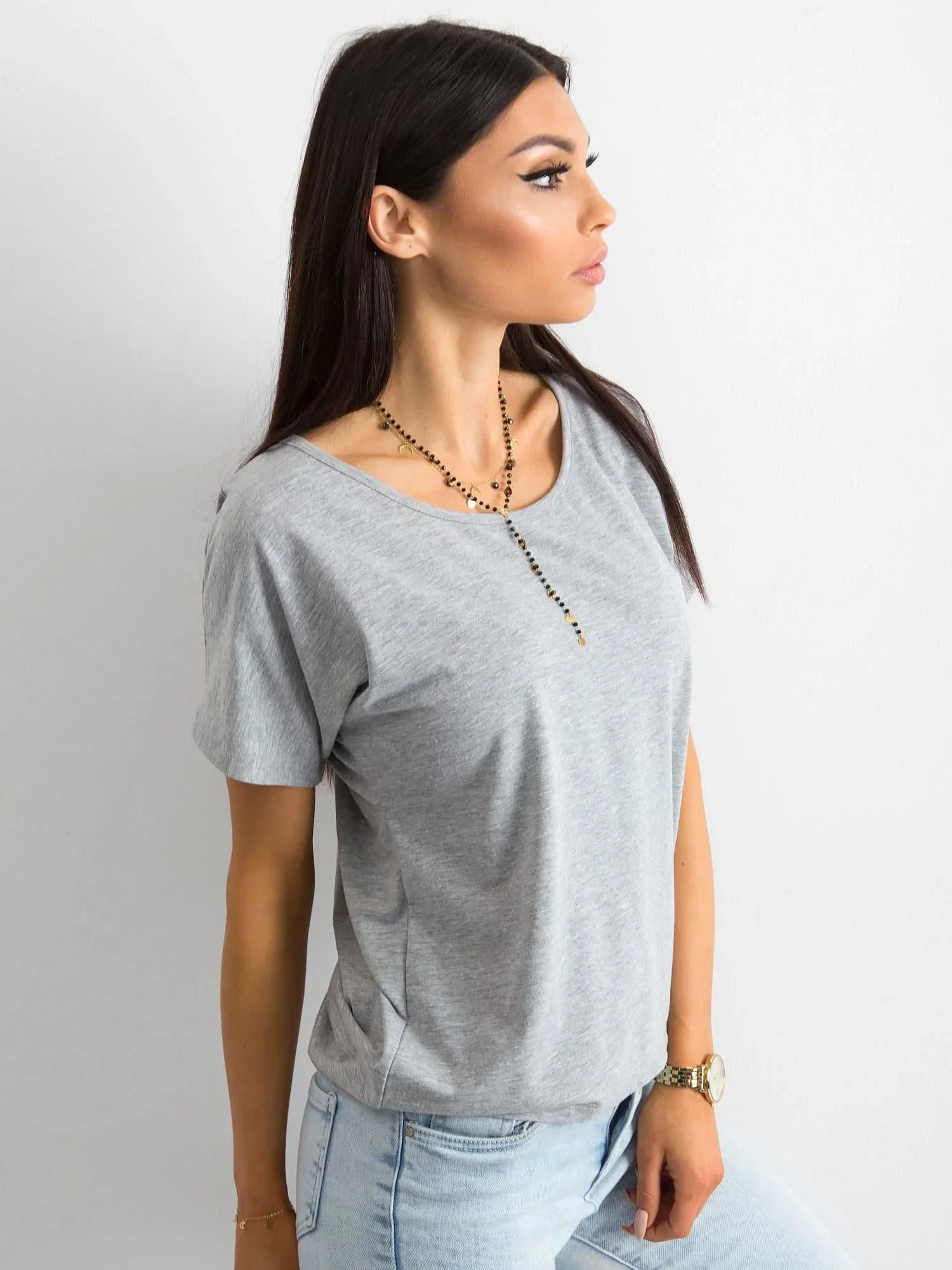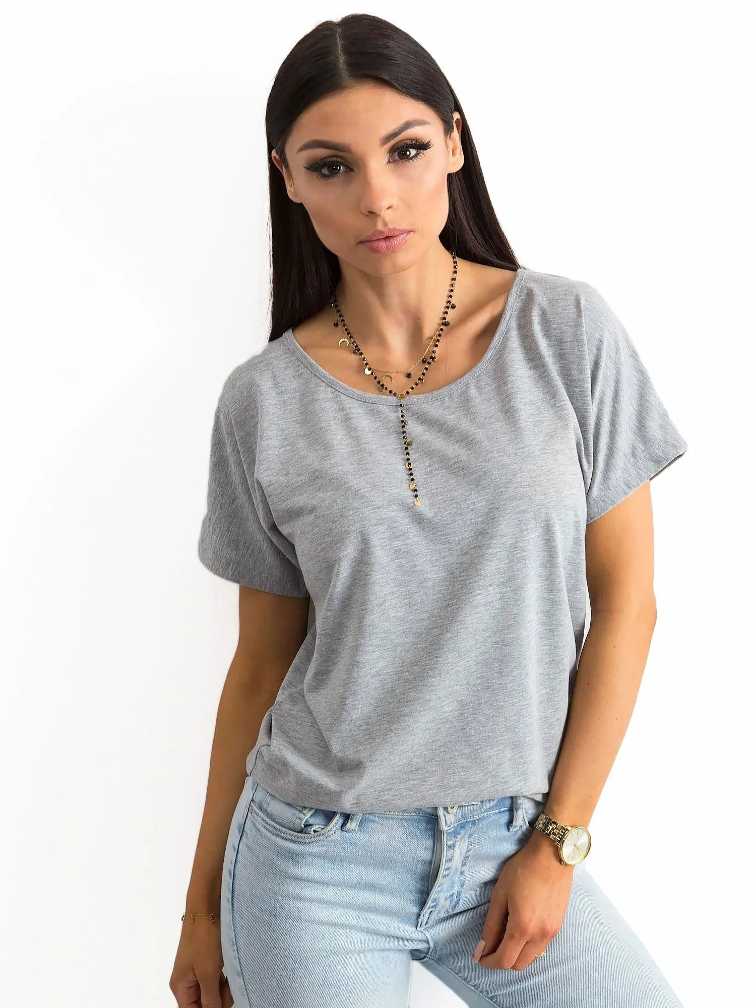 Šedé tričko Flow. Hladká bavlněná trička volnějšího střihu jsou ideálním nápadem pro módní a pohodlné každodenní oblečení. Lze je nosit samostatně nebo zastrčené pod halenkami, saky či lehkými bundami. Nabízejí spoustu možností stylingu s různými druhy oblečení, protože se hodí téměř ke všemu. Toto základní tričko má širší výstřih, krátké rukávy a trochu ležérnější střih. Díky tomu je velmi pohodlný, neomezuje v pohybu a měkce sedí na ženské postavě. Na zadní straně má toto dámské tričko decentní ozdobu, která svou přítomností tričku nedominuje. Je vyroben z přírodní bavlny s příměsí malého množství elastických vláken, díky čemuž je materiál prodyšný a příjemný na dotek. Nosí se k módním džínám a látkovým kalhotám, ale i ke kraťasům a sukním z naší online kolekce.