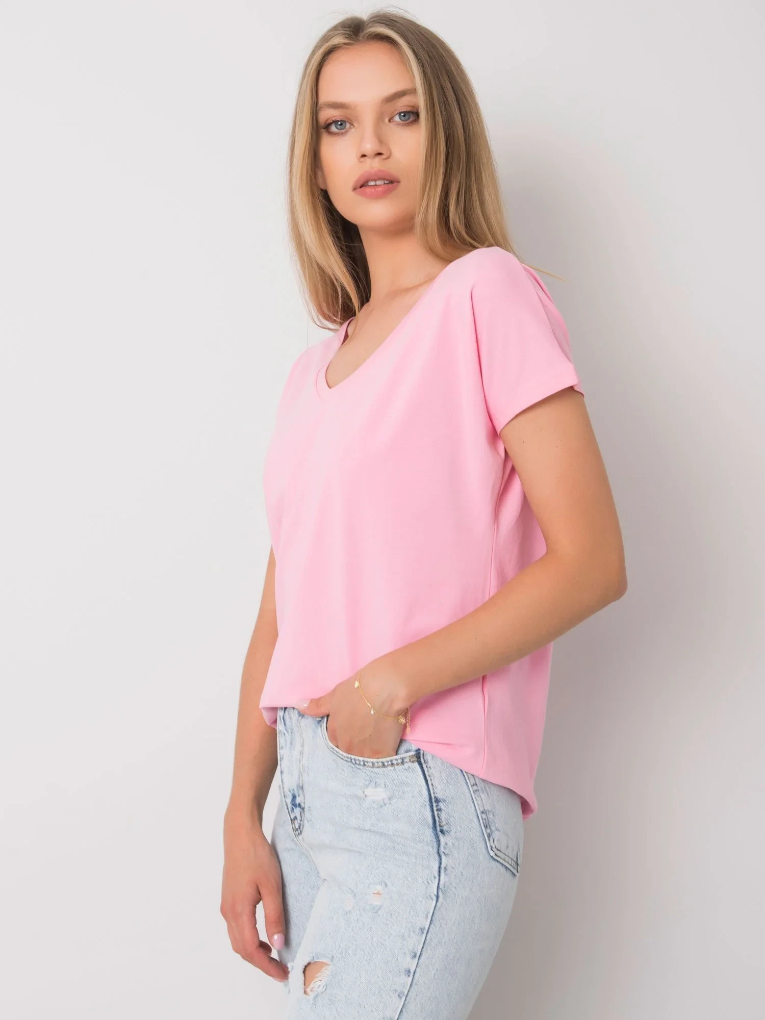 Tričko s výstřihem do V ve světle růžové barvě.