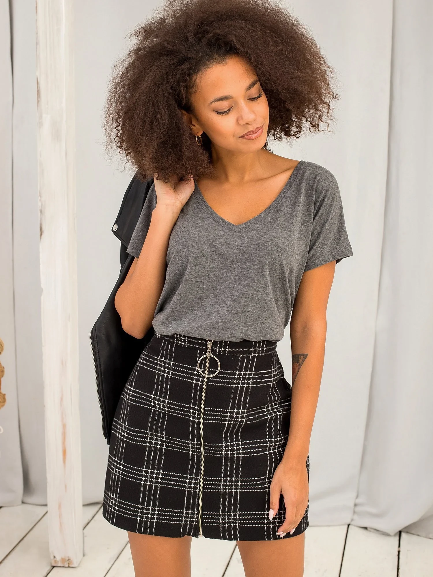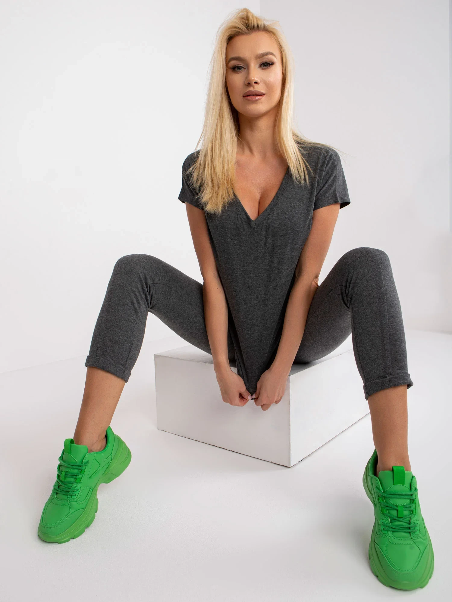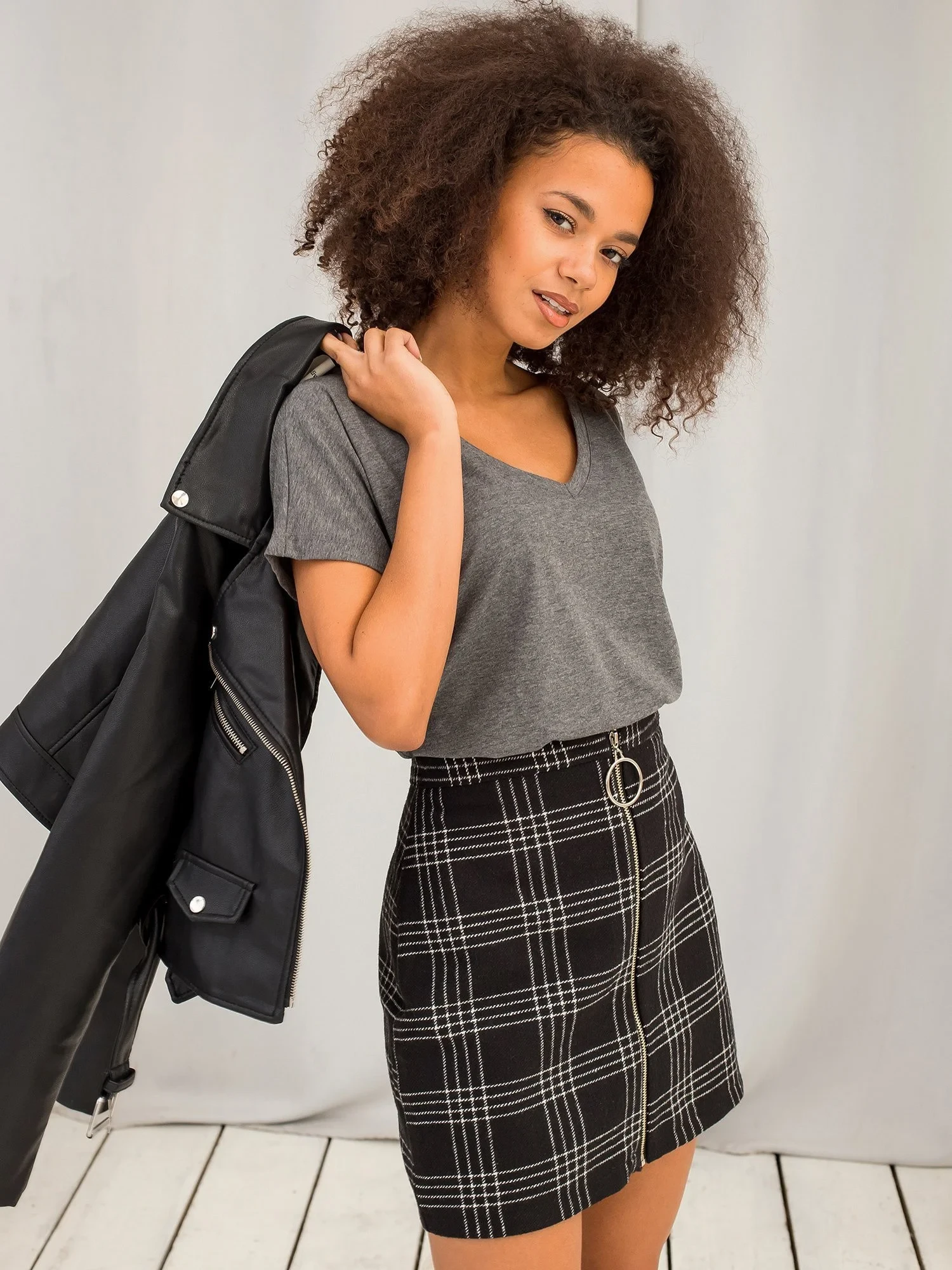Modelka má na sobě velikost XS. Rozměry modelky: výška 175 cm, prsa 90 cm, pas 60 cm, boky 90 cm.