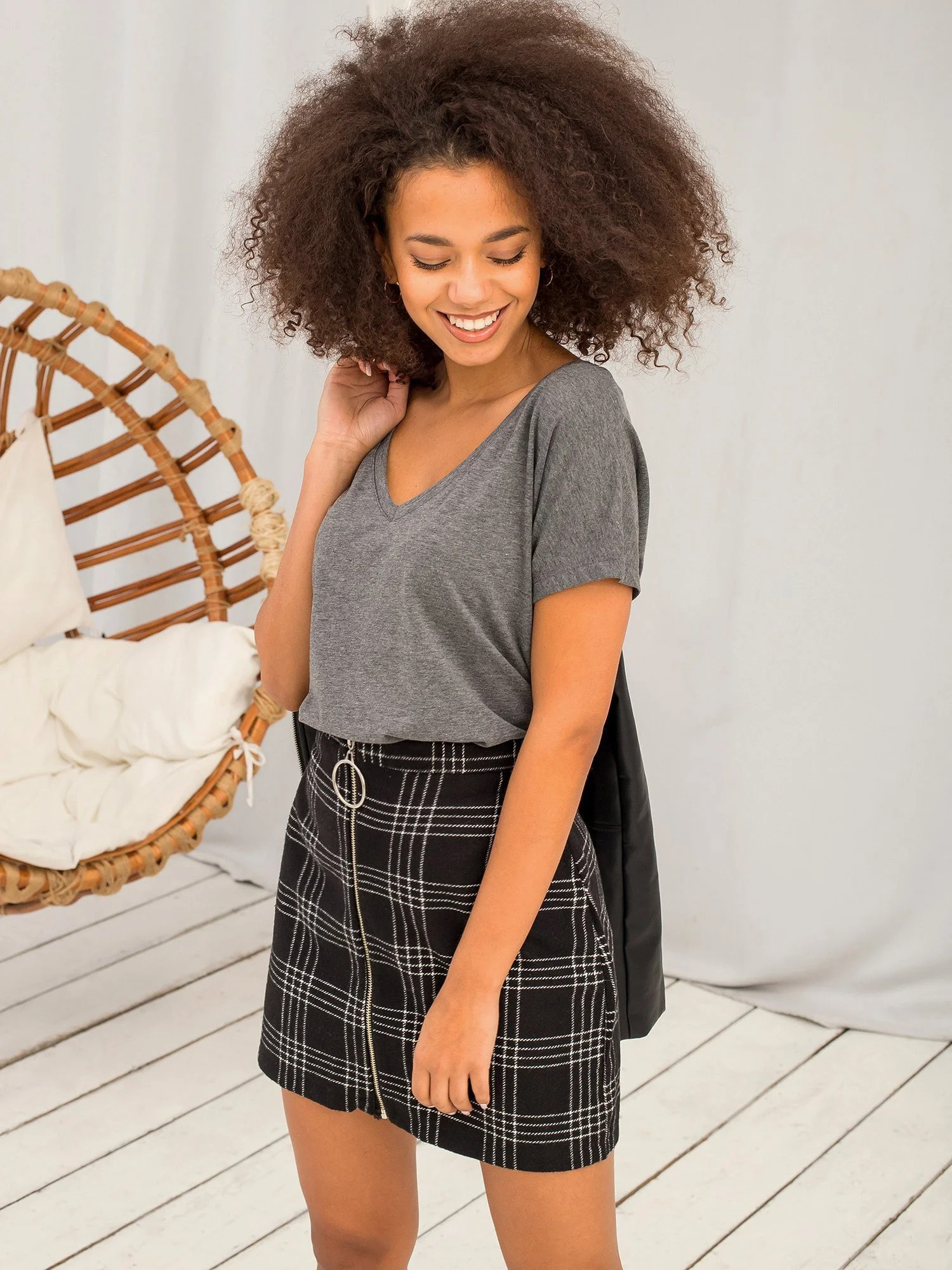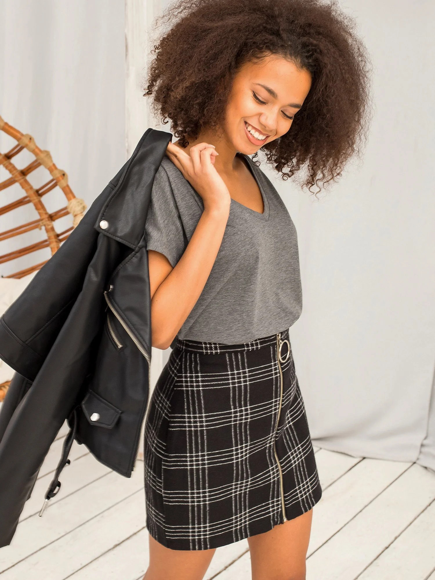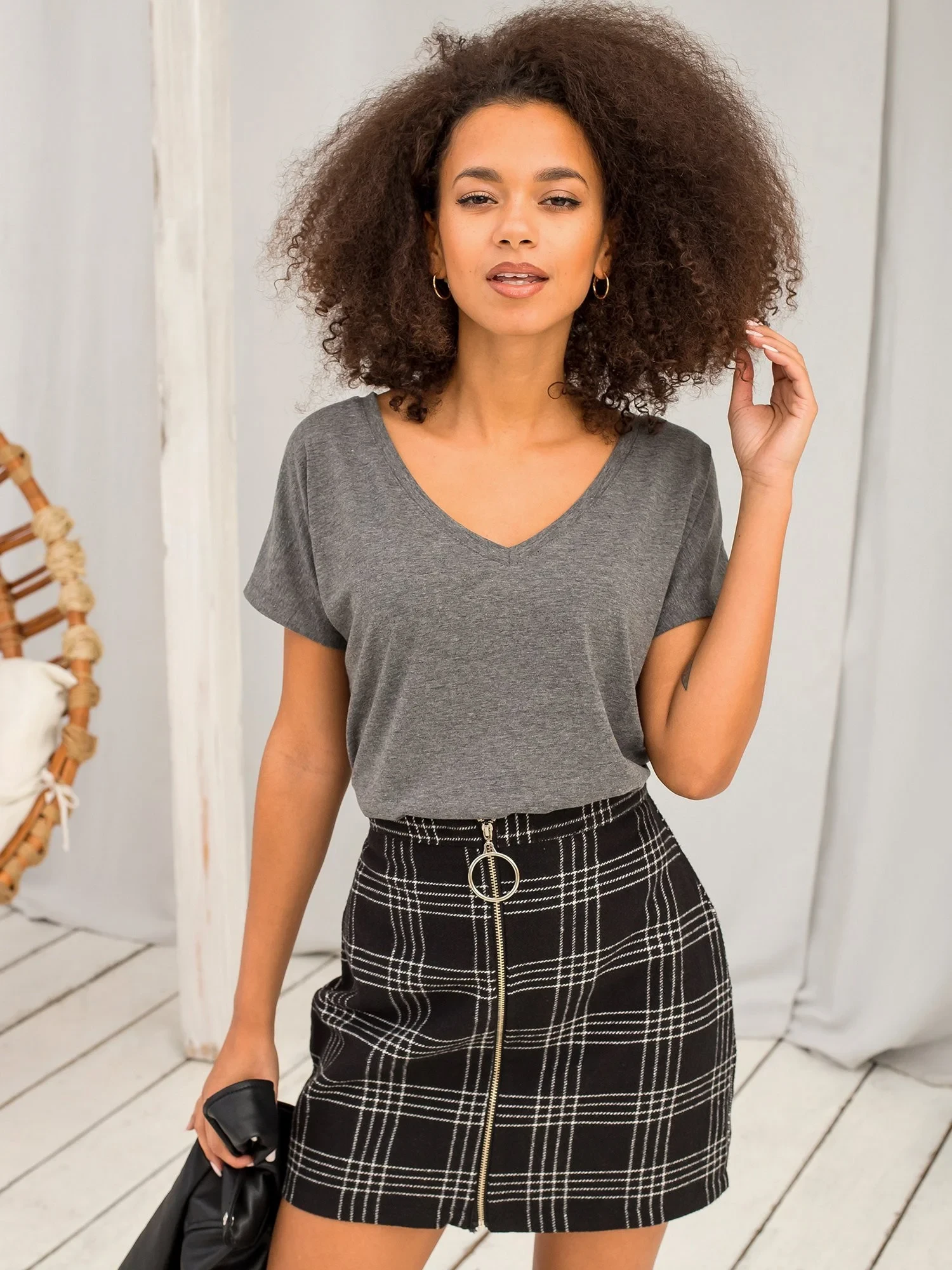 Modelka má na sobě velikost XS. Rozměry modelky: výška 175 cm, prsa 90 cm, pas 60 cm, boky 90 cm.
