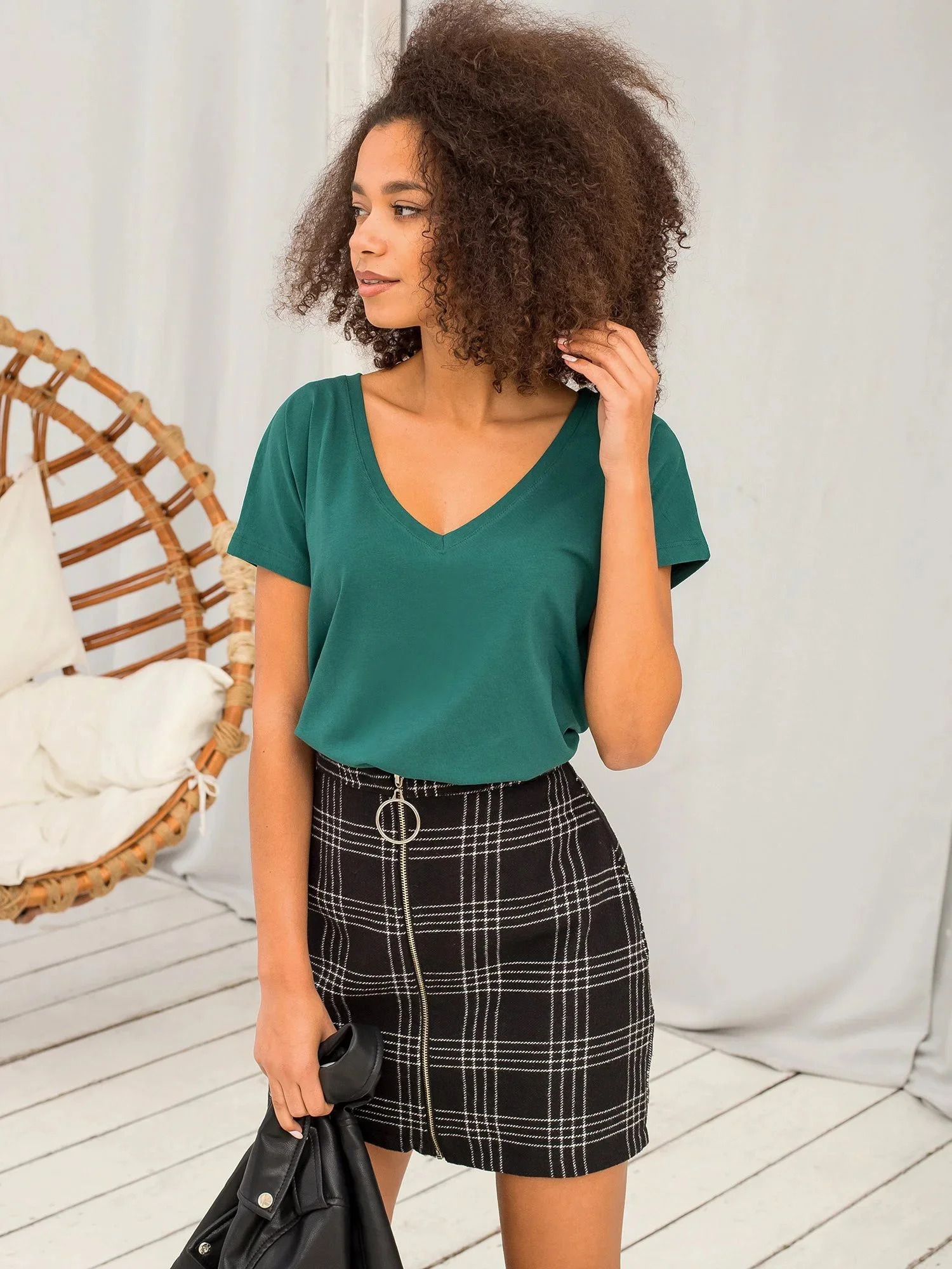 Modelka má na sobě velikost XS. Rozměry modelky: výška 175 cm, prsa 90 cm, pas 60 cm, boky 90 cm.
