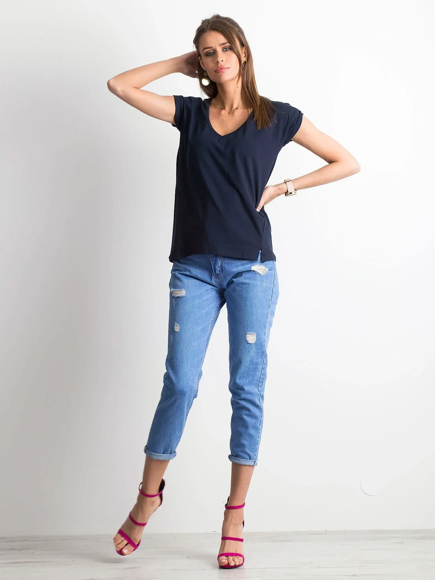 Námořnickymodré bavlněné tričko s výstřihem.
