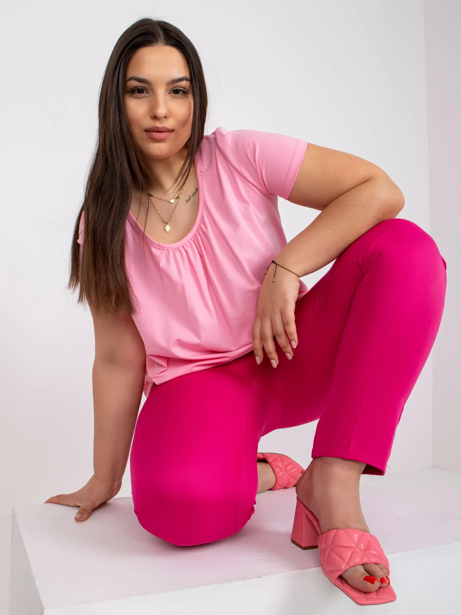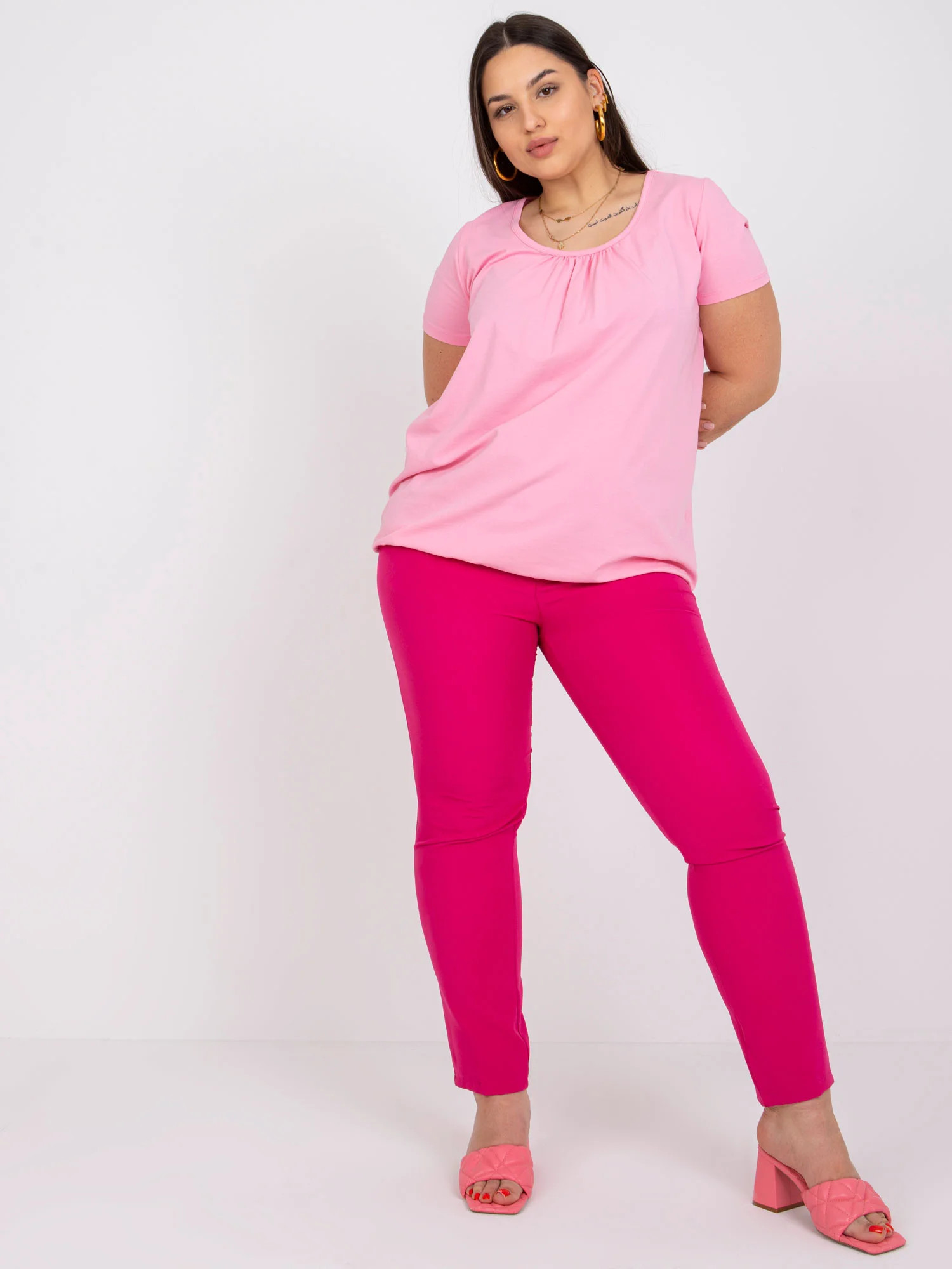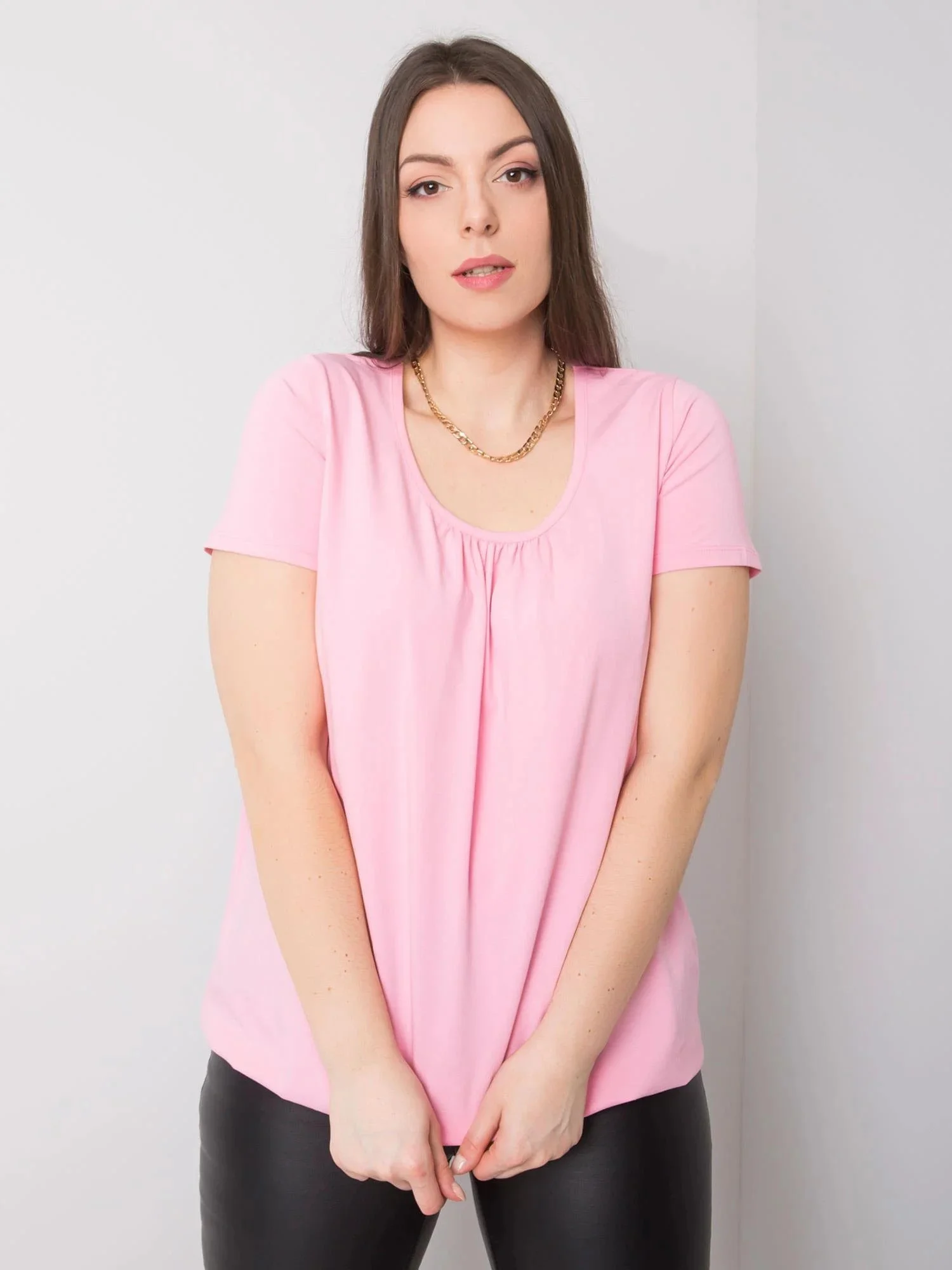 Modelka má na sobě velikost XL. Rozměry modelky: výška 171 cm, poprsí 96 cm, pas 74 cm, boky 109 cm.