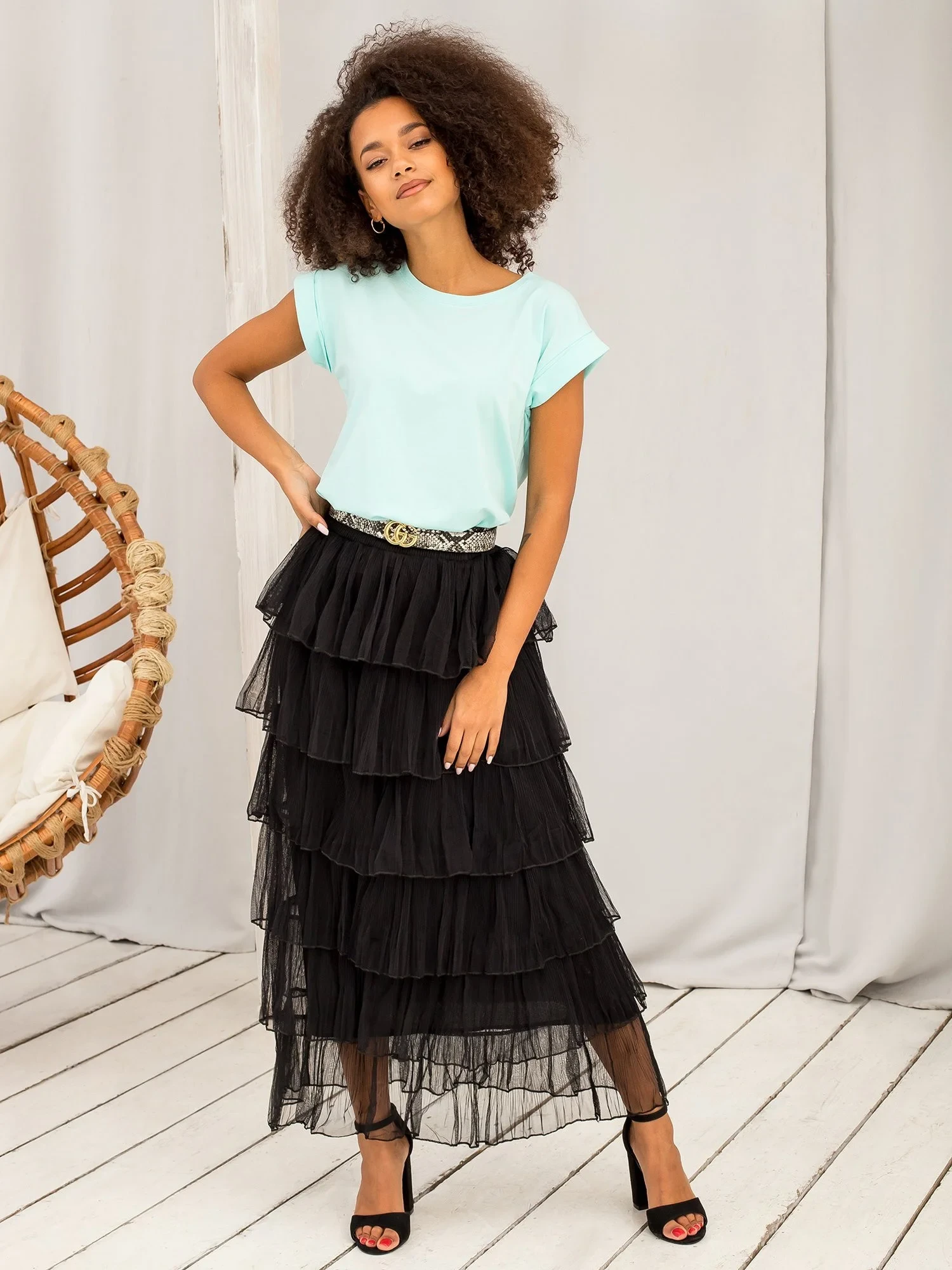 Modelka má na sobě velikost S. Rozměry modelky: výška 176 cm, prsa 85 cm, pas 64 cm, boky 92 cm.