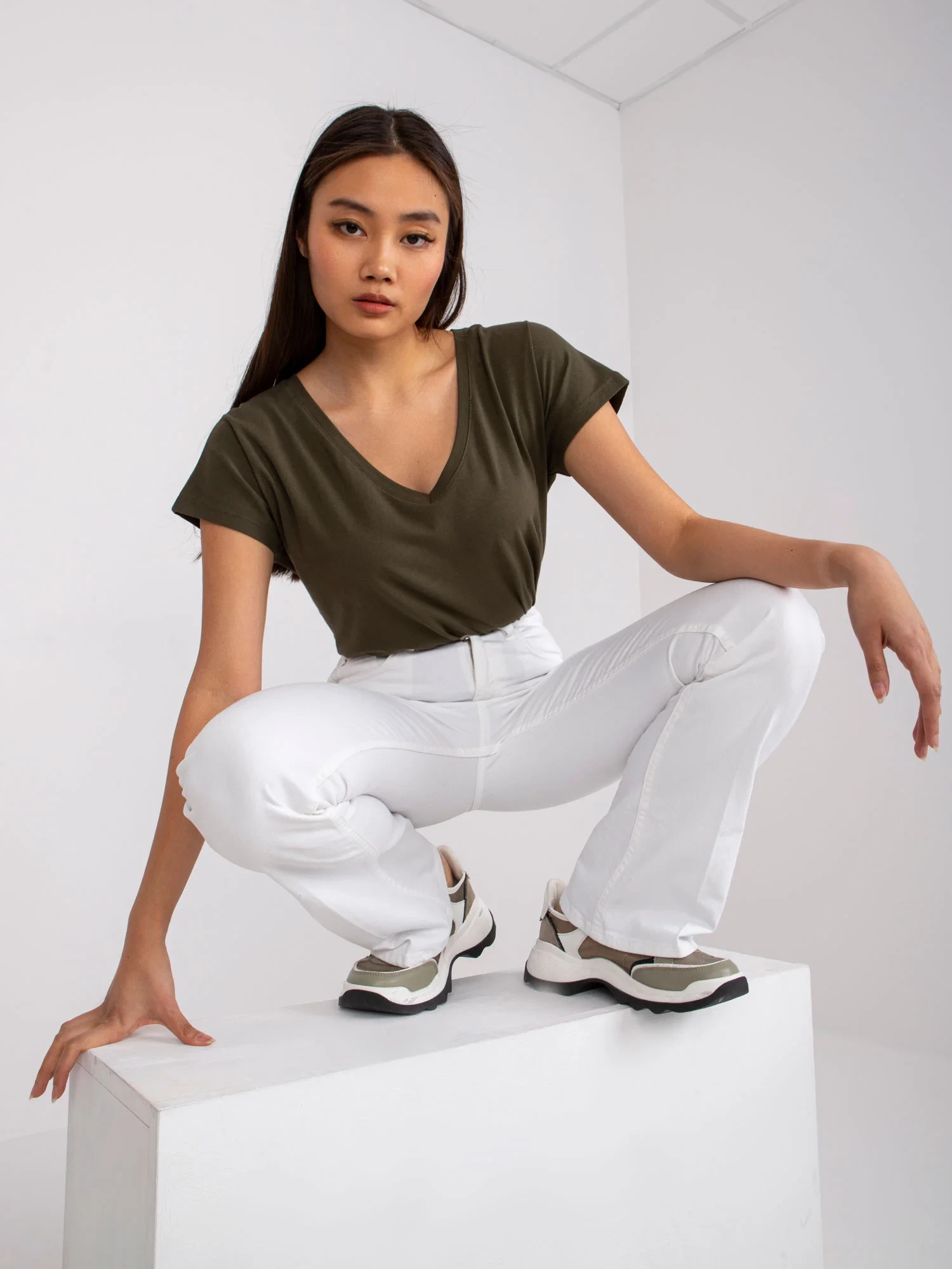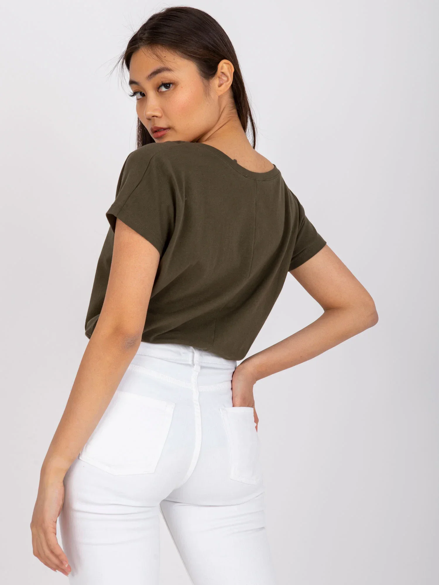 Bavlněné tričko s výstřihem do V v khaki barvě.