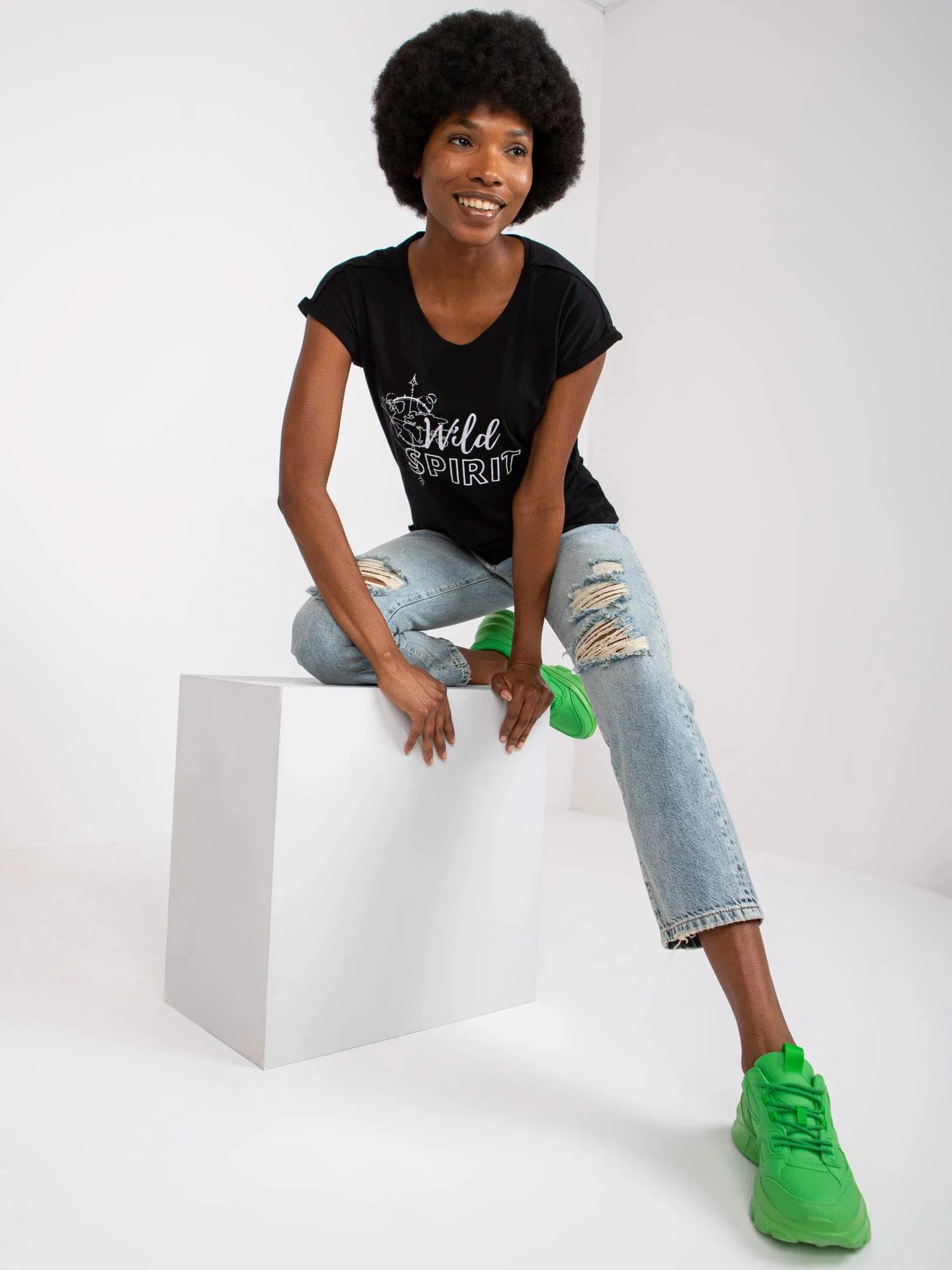 Modelka má na sobě velikost S. Rozměry modelky: výška 178 cm, prsa 82 cm, pas 63 cm, boky 93 cm.