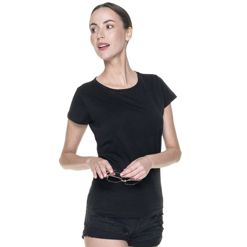 Dámské tričko s krátkým rukávem v chrpově modré barvě, vyrobené z mimořádně příjemné a hladké jednolícní tkaniny klasického střihu. Materiál je vypraný enzymem, takže je bez nerovností. Materiál je opatřen silikonovou úpravou, díky níž je měkký a příjemný na dotek. Výstřih je zakončen dvouvrstvým žebrováním s elastanem pro delší životnost. Výstřih a ramena s kontrastní zpevňující a stabilizační páskou, která má pozitivní vliv na odolnost švů. Bezešvé boky pro větší pohodlí při nošení a více možností potisku. Tričko má dvojité husté prošití, na které byly použity nitě nejvyšší kvality.