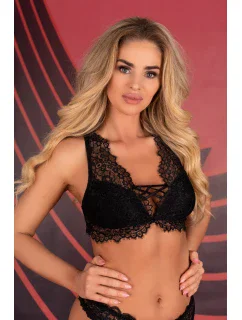 Sexy souprava z černé krajky. Nápadná podprsenka s otevřenými košíčky, které jsou navíc pokryté krajkou zapínanou za krkem. Když je podprsenka zapnutá, vypadá jako top, zatímco když krajku odepnete, získáte pikantní efekt holých prsou... Trojúhelníková tanga přes hýždě, velmi smyslná. Podvazkový pás se zapíná nad hýžděmi. Složení: 100% polyamid.EAN čárové kódy zboží jsou: