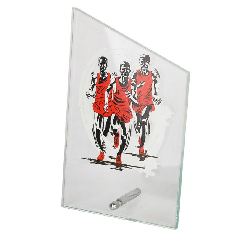 Trofej ze skla s kovovou podložkou s motivem maratonu. Na desku je možné provést rytinu - doplňková služba (cena závisí na ploše potisku).