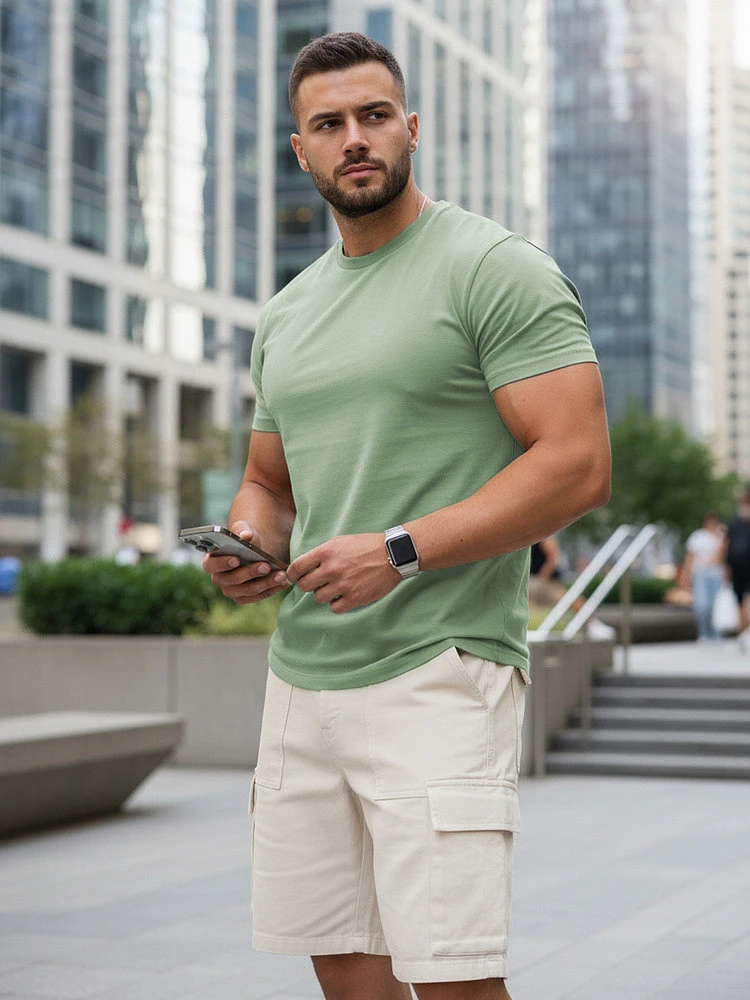 Minimalistyczny T-shirt o ponadczasowym charakterze stanowi solidną bazę codziennych stylizacji. Gładka powierzchnia podkreśla uniwersalność i pozwala na łatwe dopasowanie do różnych elementów garderoby. Naturalna tkanina zapewnia komfort noszenia przez cały dzień. Regularny fason zapewnia swobodę ruchów i wygodne dopasowanie.