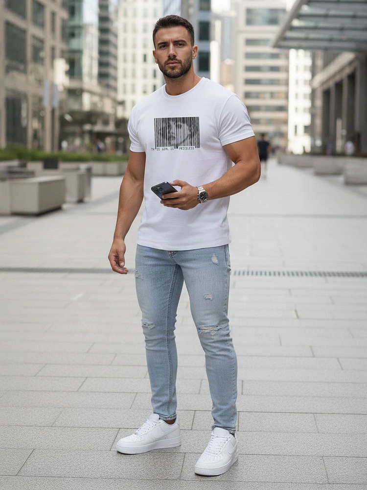 Stylowa koszulka z nowoczesnym nadrukiem stanowi ciekawy element codziennych stylizacji. Wykonana z wysokiej jakości bawełny zapewnia komfort noszenia i odpowiednią przewiewność. Dopasowany krój dobrze podkreśla sylwetkę, zachowując swobodę ruchów. Minimalistyczna forma z wyrazistym akcentem graficznym wpisuje się w miejski styl.
