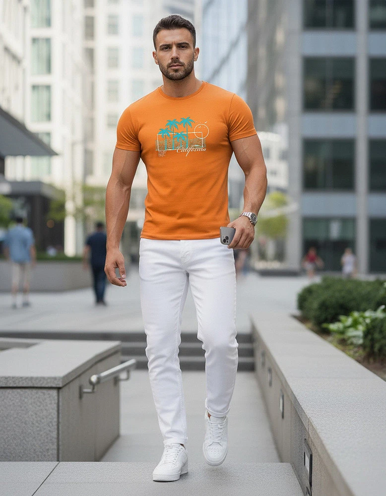 Stylowy t-shirt z nadrukiem inspirowanym motywem wakacyjnym stanowi uzupełnienie codziennych stylizacji. Dopasowany fason dobrze układa się na sylwetce, podkreślając jej atuty. Graficzny motyw dodaje lekkości i nowoczesnego charakteru.