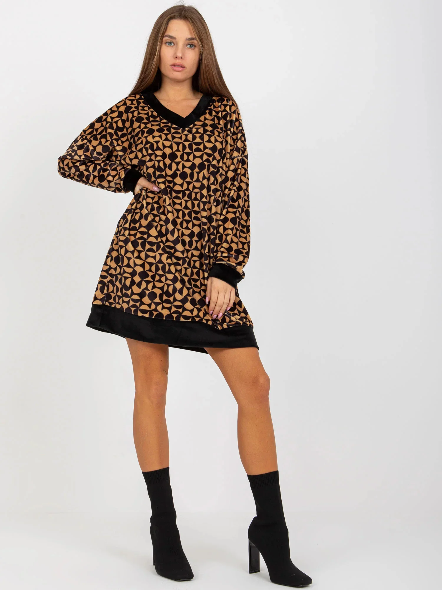 Modelka má na sobě velikost S/M. Rozměry modelky: výška 163 cm, poprsí 86 cm, pas 56 cm, boky 88 cm.