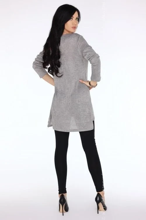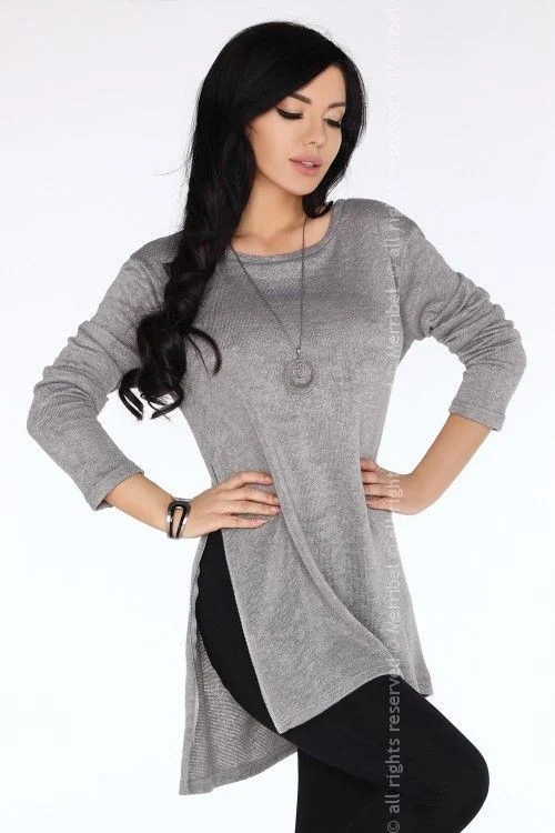 Zajímavá tunika z měkkého, pružného úpletu. Úspěšně nahradí halenku, tuniku i svetr. Má jemnou šedou barvu a rovný střih, který zdobí dva posuvné zipy umístěné na obou stranách tuniky. Můžete je libovolně rušit a stále vytvářet nové styly. Složení: 85 % polyester, 15 % bavlna.