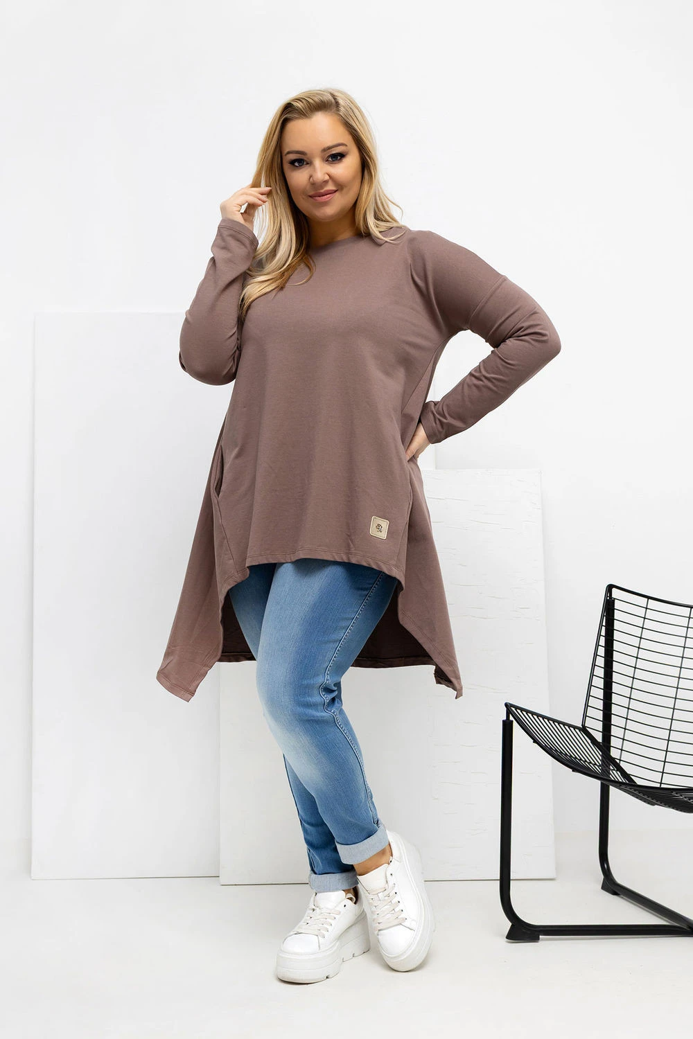 Elegantní tunika plus size s prodlouženým, asymetrickým střihem je skvělou volbou pro ženy, které ocení pohodlí a moderní vzhled. Vyrobená z měkkého, příjemného na dotek materiálu se krásně přizpůsobuje postavě, poskytujíc volnost pohybu a jemné zeštíhlení postavy. Model kombinuje střih tuniky a asymetrické šaty, takže se skvěle hodí jak k legínám, tak i jako samostatné, volné šaty. Klasický, kulatý výstřih zdůrazňuje krk a hodí se ke každému outfitu. Dlouhý rukáv je ideální na chladnější dny. Praktické kapsy skryté v bočních švech dodávají pohodlí a funkčnost. Na přední straně dole je malá nášivka, která celku dodává módní charakter. Tunika se obléká přes hlavu, což zajišťuje rychlé a pohodlné nasazení. Moderní, pohodlná a stylová tunika skvěle doplní každodenní outfit, a její prodloužený, asymetrický střih skvěle podtrhne výhody postavy plus size.
