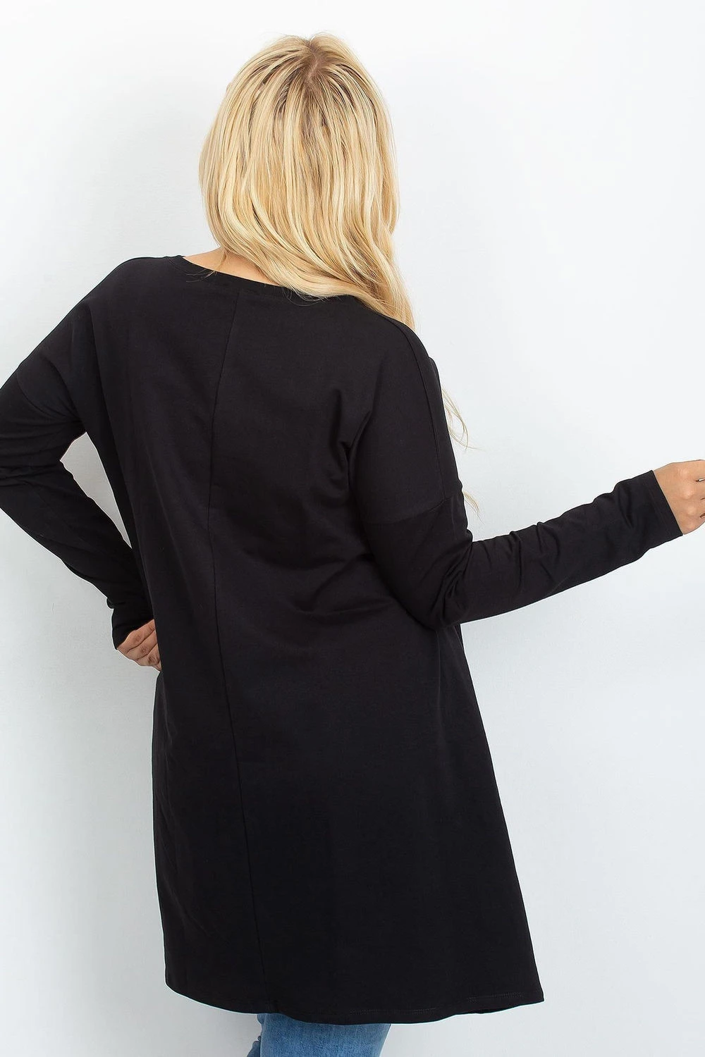 Elegantní tunika plus size s prodlouženým, asymetrickým střihem je skvělým návrhem pro ženy, které oceňují pohodlí a moderní vzhled. Vyrobená z měkkého, příjemného materiálu, krásně padne na postavě, poskytuje volnost pohybu a jemně zjemní figuru. Model kombinuje střih tuniky a asymetrické šaty, díky čemuž se skvěle hodí jak k legínám, tak i jako samostatné, volné šaty. Klasický, kulatý výstřih zdůrazňuje krk a hodí se ke každému outfitu. Dlouhý rukáv, ideální na chladnější dny. Praktické kapsy skryté v bocích švů, které dodávají pohodlí a funkčnost. Na přední straně dole je malá nášivka, která celkově dodává módní charakter. Tunika se obléká přes hlavu, což zajišťuje rychlé a pohodlné nasazování. Moderní, pohodlná a stylová, skvěle doplní každodenní outfit, a její prodloužený, asymetrický střih dokonale zdůrazní výhody postavy plus size.