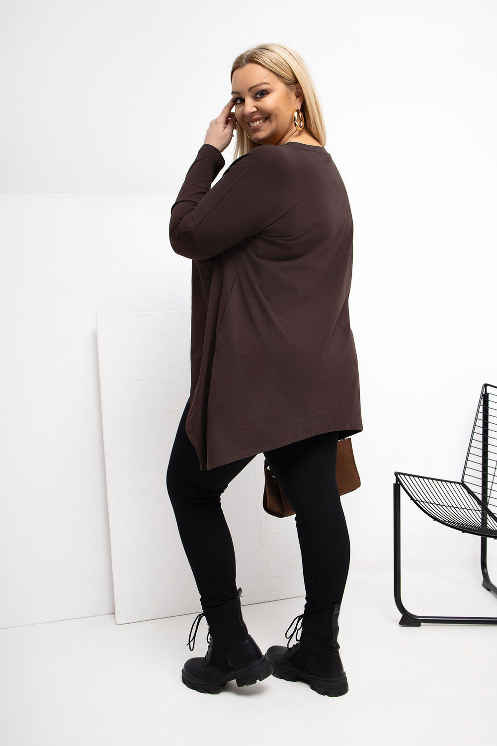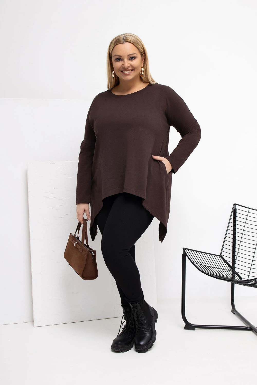 Blůza dámská velikosti plus je pohodlný a stylový návrh ideální pro každodenní outfit v casualovém provedení. Vyrobená z vysoce kvalitní bavlny s přídavkem elastanu je měkká, pružná a příjemná na kůži, což zajišťuje pohodlí při nošení po celý den. Hladký materiál jí dodává univerzální charakter a usnadňuje kombinaci s různými kousky šatníku. Model se vyznačuje dlouhým střihem a asymetrickým spodkem, který jemně zeštíhlí postavu a přidá moderní styl. Absence zapínání zdůrazňuje volný střih blůzy a praktické kapsy skryté v bočních švech zvyšují její funkčnost. Jedná se o skvělou volbu na každý den do práce, na procházku nebo setkání v neformálním kruhu, spojující pohodlí s moderním vzhledem.