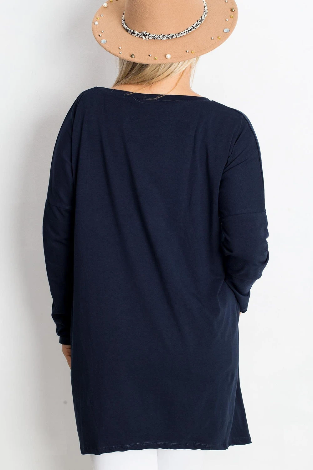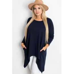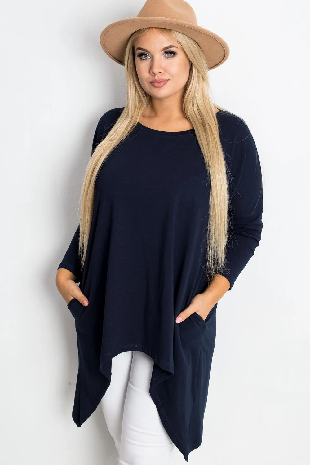 Blůza dámská velikost plus je pohodlný a stylový návrh ideální pro každodenní outfit v casualovém provedení. Vyrobená z vysoké kvality bavlny s přídavkem elastanu je měkká, pružná a příjemná na pokožku, což zaručuje pohodlí po celý den. Hladký materiál jí dodává univerzální charakter a usnadňuje kombinování s různými kousky šatníku. Model je výrazný prodlouženým střihem a asymetrickým spodkem, který jemně zúží postavu a přidá moderního stylu. Bez zapínání zdůrazňuje volný střih blůzy a praktické kapsy skryté v bocích švů zvyšují její funkčnost. Je to skvělá volba na každý den do práce, na procházku nebo setkání v neformálním kruhu, spojující pohodlí s módním vzhledem.