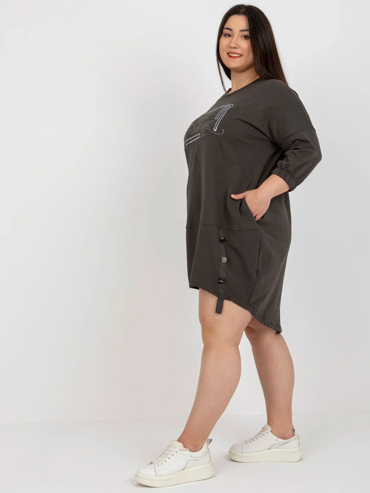 Wymiary sukienki w rozmiarze one size mierzone na płasko: szerokość pod pachami - 68 cm, długość rękawa - 45 cm, długość całkowita (przód) - 83 cm, długość całkowita (tył) - 94 cm .