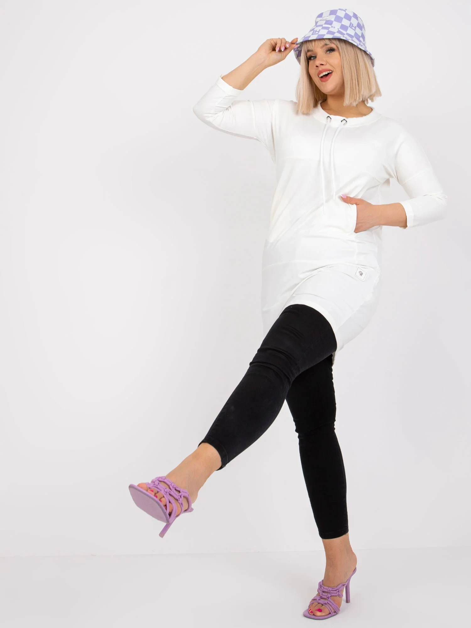 Rozměry tuniky v jedné velikosti měřené na plocho: šířka v podpaží - 57 cm, délka rukávu - 45 cm, celková délka - 85 cm .