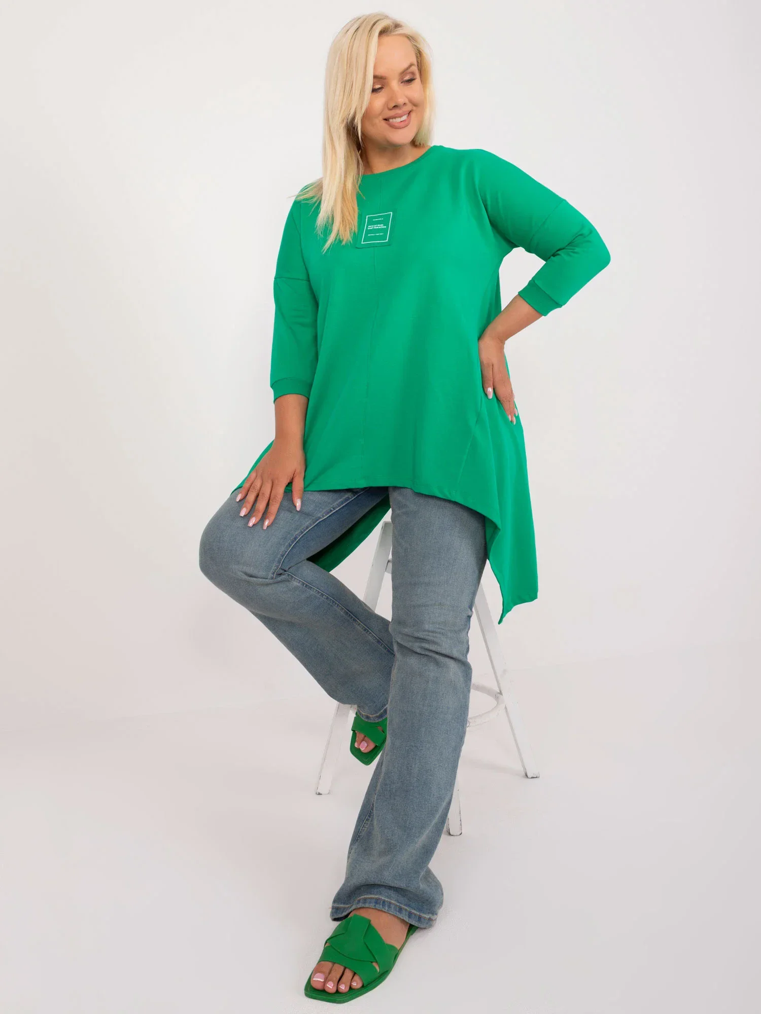 Wymiary bluzki w rozmiarze one size mierzone na płasko: szerokość pod pachami - 58 cm, długość rękawa - 42 cm, długość całkowita (przód) - 72 cm, długość całkowita (tył) - 89 cm.