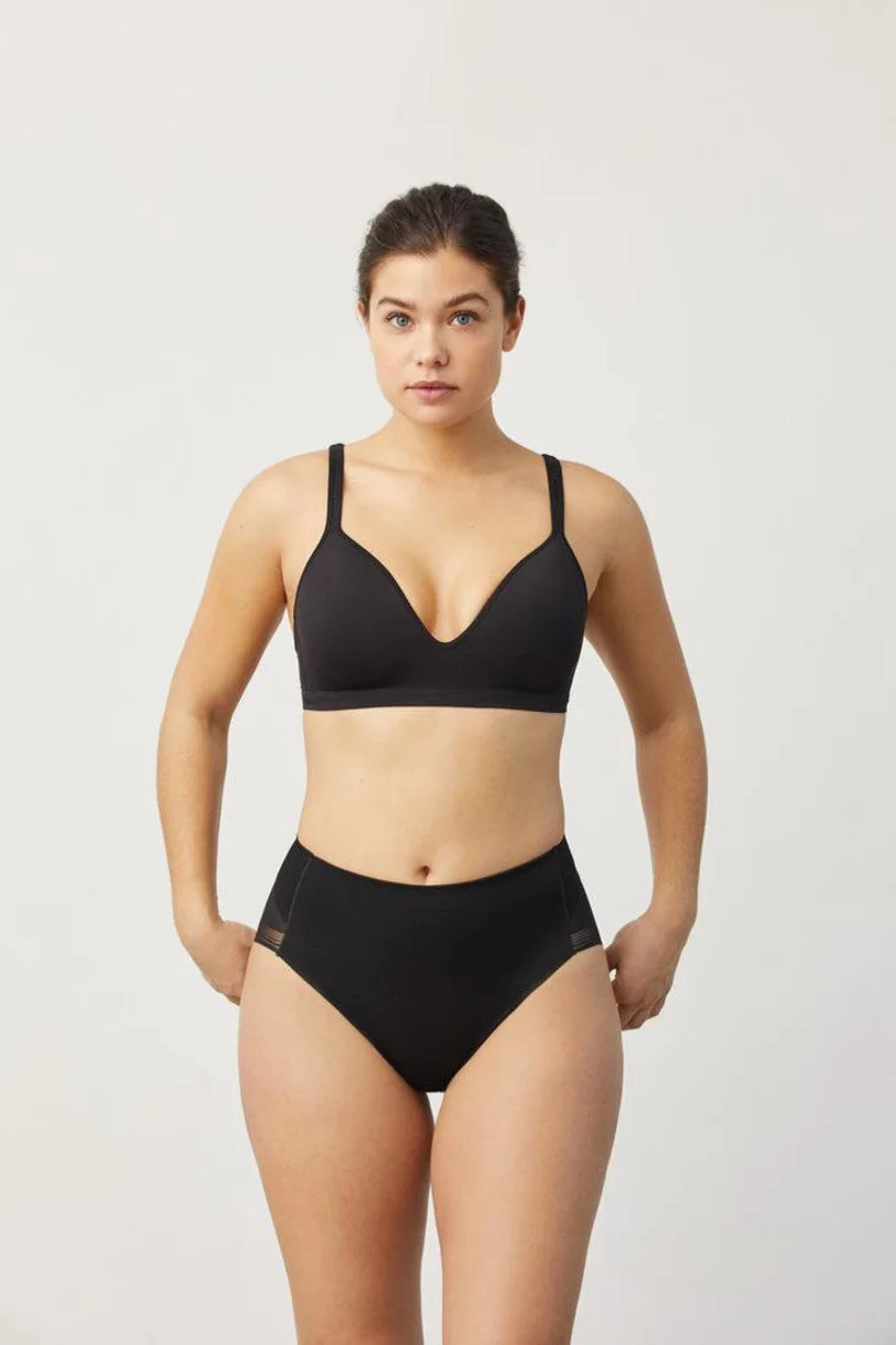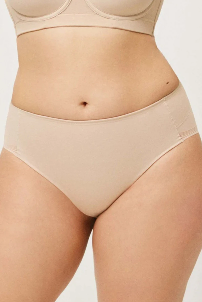 Gładki, elastyczny materiał świetnie pracuje z ciałem i dobrze układa się pod ubraniem. Beżowy wariant sprawdzi się szczególnie pod jasne stylizacje, a czarny pozostaje ponadczasową bazą na co dzień. Subtelne, półtransparentne paski przy wycięciach na nogi dodają lekkości i kobiecego charakteru, nie wpływając na wygodę noszenia. To bielizna, którą zakładasz raz i zapominasz, że masz ją na sobie.