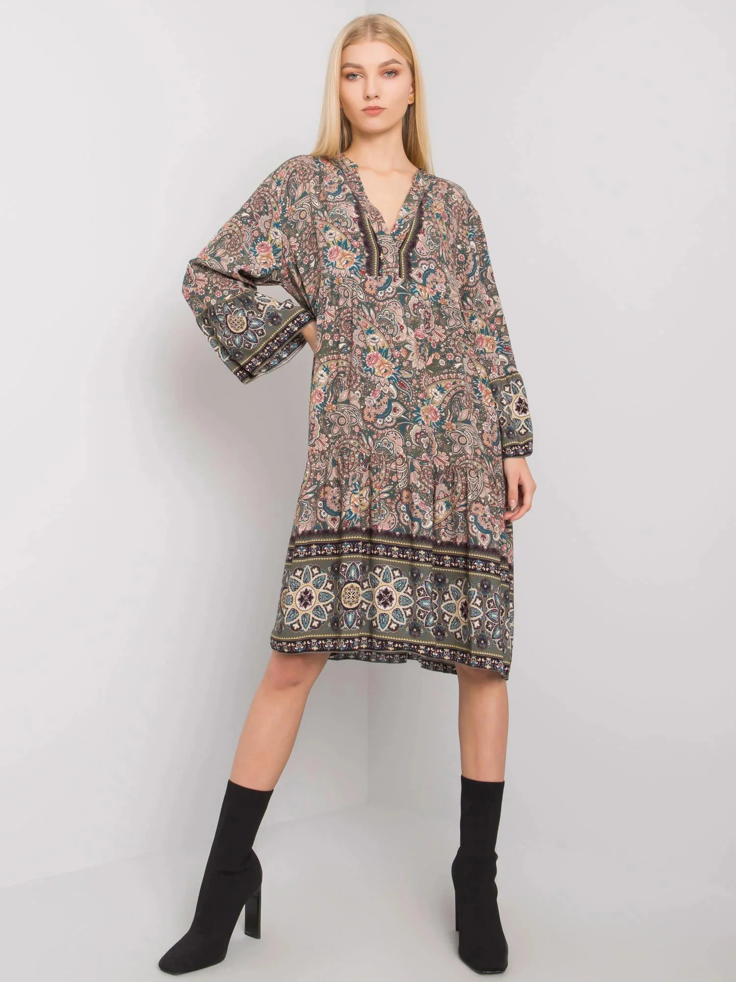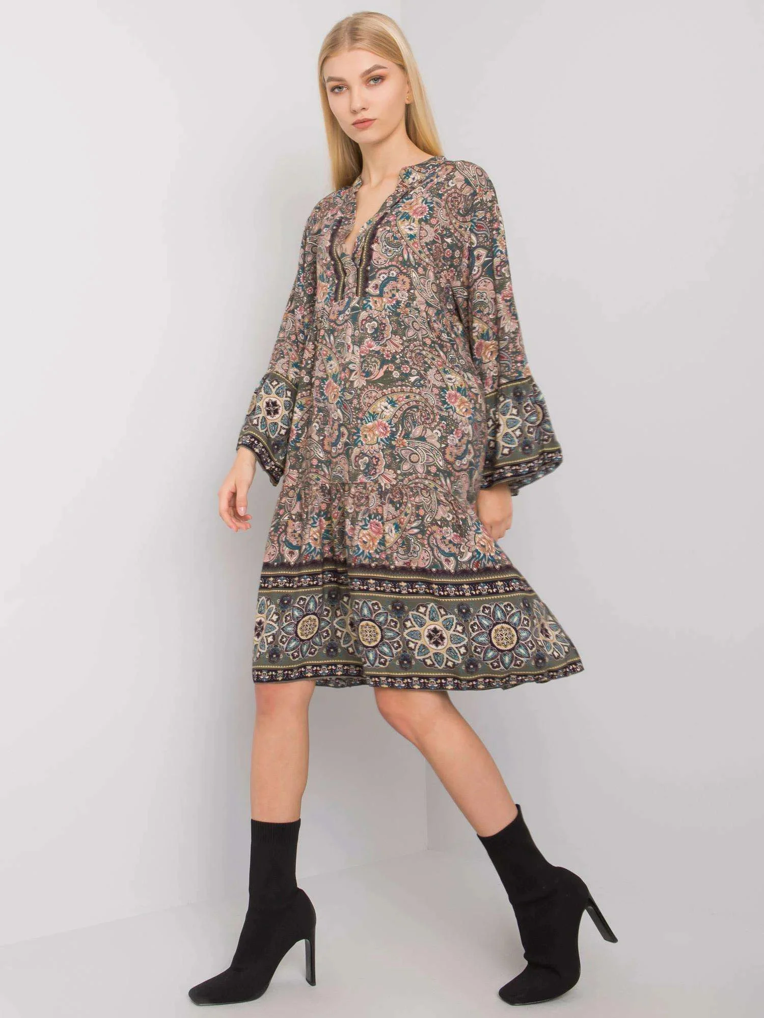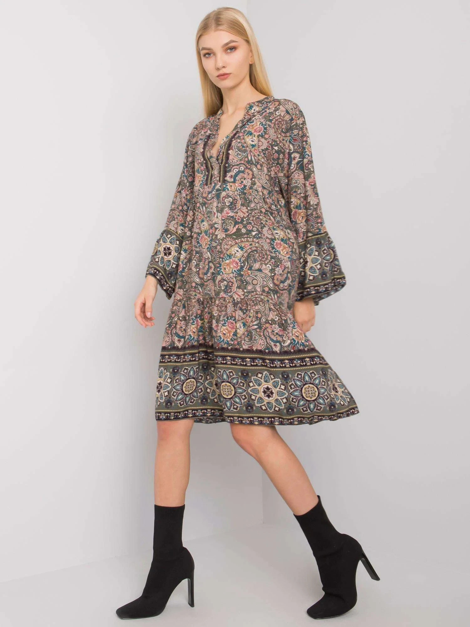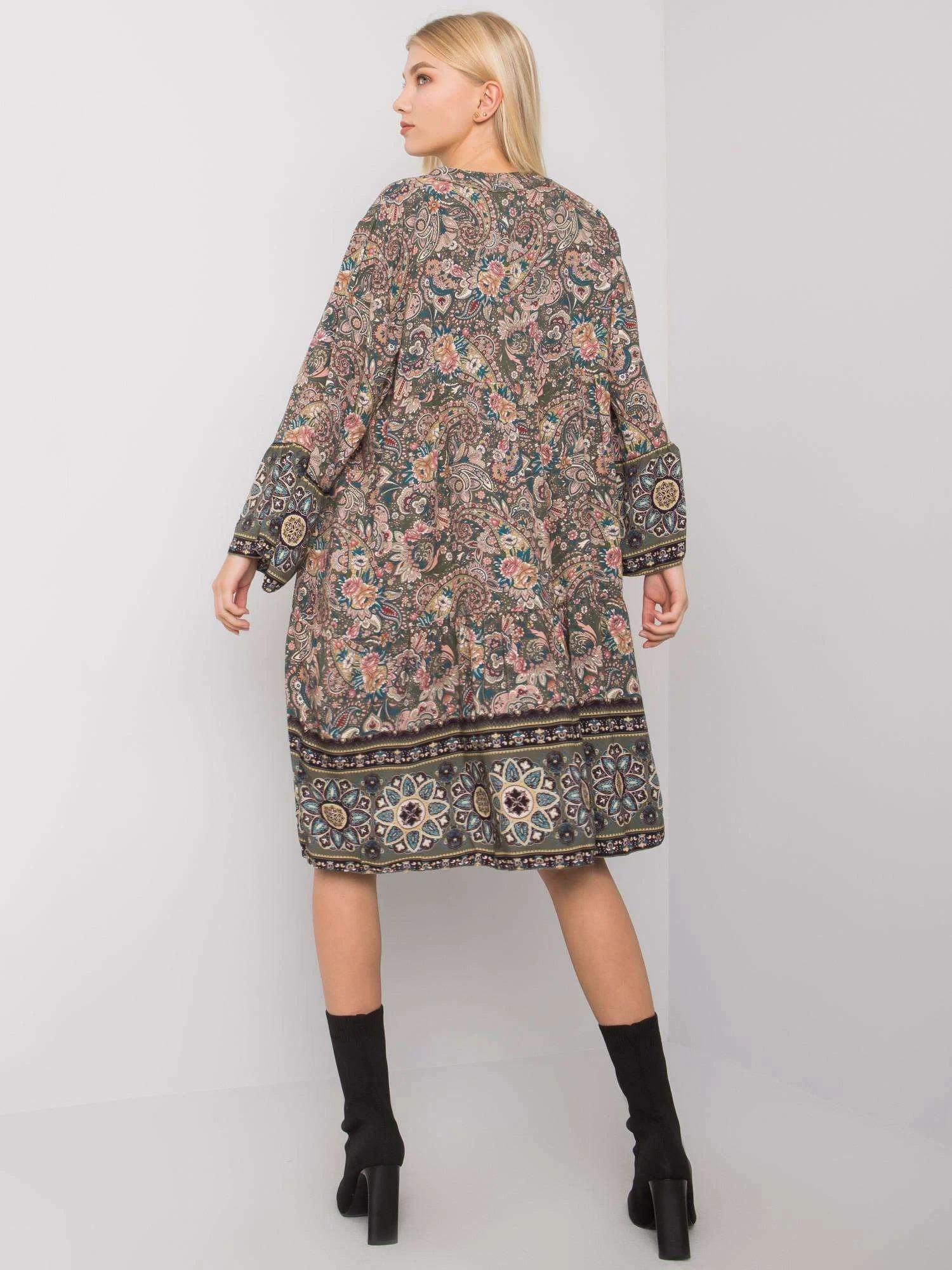 Wymiary sukienki w rozmiarze one size mierzone na płasko: szerokość pod pachami - 51 cm, długość całkowita - 92 cm, długość rękawa - 53 cm