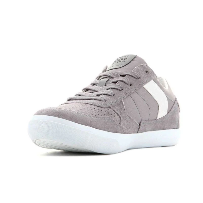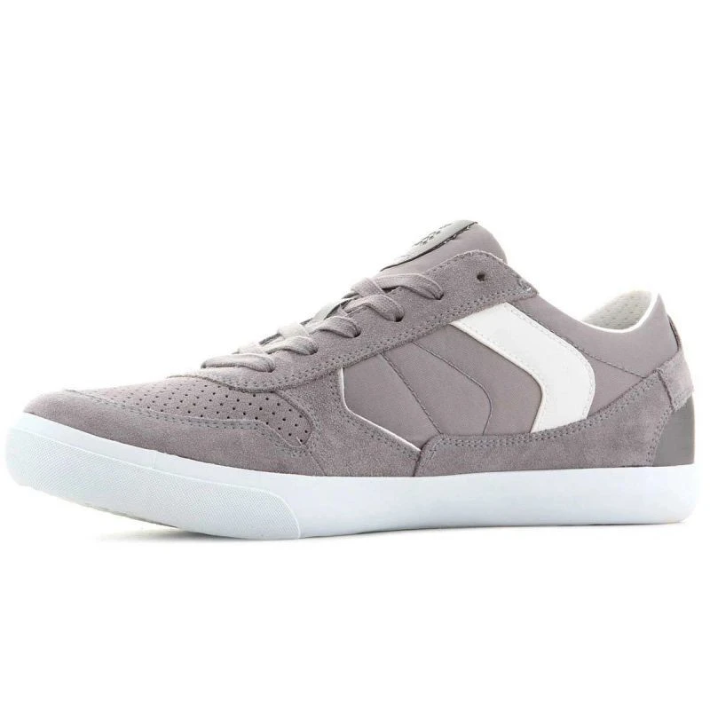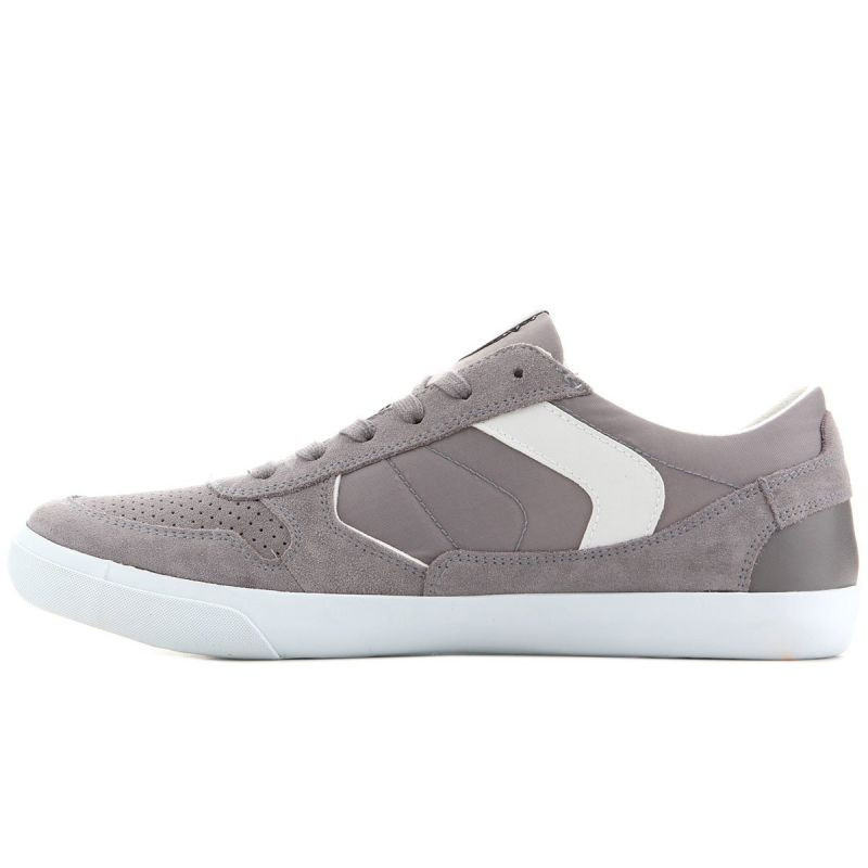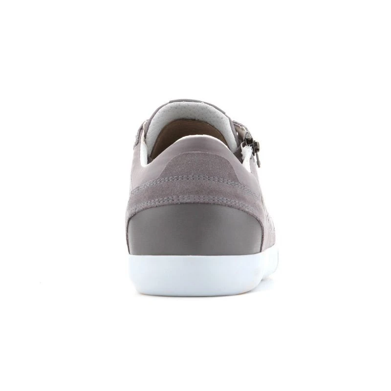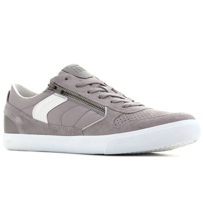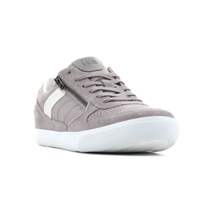 Tato obuv kombinuje sportovní styl s městskou elegancí. Šedý svršek je vyroben z kombinace semišové kůže a textilního materiálu. Kontrastní bílé vsadky na bocích a bílá podrážka umocňují celkový vzhled obuvi. Kromě tradičního šněrování je na boku svršku umístěn zip. Velmi pečlivé zpracování charakterizuje smysl pro detail. Pevná podrážka s dezénem z hadí kůže.