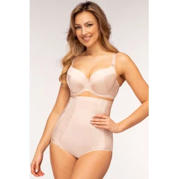 Biustonosz marki Unikat. Model Fiona. Posiada druty, które podpierają piersi odpowiednio je kształtując. Fiszbiny pionowe osadzone na bokach. Produkt posiada regulowane ramiączka bez możliwości ich odpięcia. Haczyki do ramiączek metalowe. Biustonosz zapinany na haftki. Miejsce zapięcia: tył. Trzy rzędy haftek pionowych. Dwa stopnie haftek poziomych. Produkt został wykonany z 83% poliamid, 12% elastan, 5% bawełna. Produkt damski.