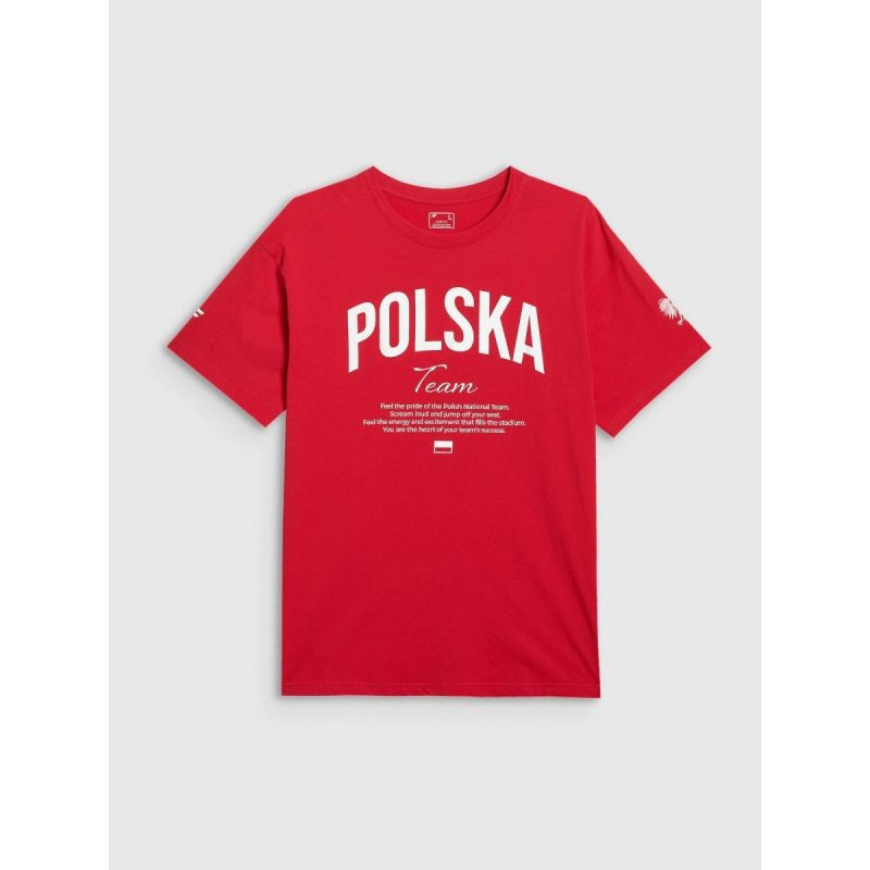červené unisexové tričko bylo vytvořeno pro fotbalové fanoušky, kteří chtějí spojit pohodlí s výrazným vlasteneckým stylem. Je vyrobeno ze 100% měkké bavlny a poskytuje pohodlí, prodyšnost a odolnost pro každodenní nošení. Díky lehkému úpletu single jersey s gramáží 160 g/m2 je tričko ideální pro fandění i každodenní styling. Výrazný potisk POLAND na přední straně a grafika na rukávech podtrhují sportovně-patriotický charakter modelu.