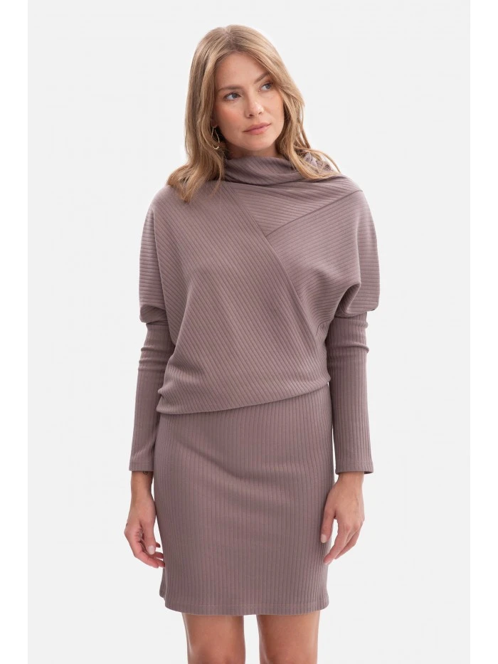 95% bavlna 5% elastan MATERIÁL Materiál: žebrovaný úplet, hmotnost 250 g PODROBNOSTI O VÝROBKU Zapínání: žádné - slip-on styl Límec: vysoký stojáček s měkkým projmutím Kapsy: žádné Rukávy: dlouhé, batwing styl, zúžené na manžetách Podšívka: žádná Model: B309 Navrženo a vyrobeno v Polsku z látky vyrobené v Polsku Modelka na fotografii měří 171 cm a má na sobě velikost S/M STYL A STŘIH Střih: dole vypasovaný, nahoře volnější a blůzový Tvar: vymezený pas, batwing vršek, tužková sukně dole Délka: mini, nad kolena