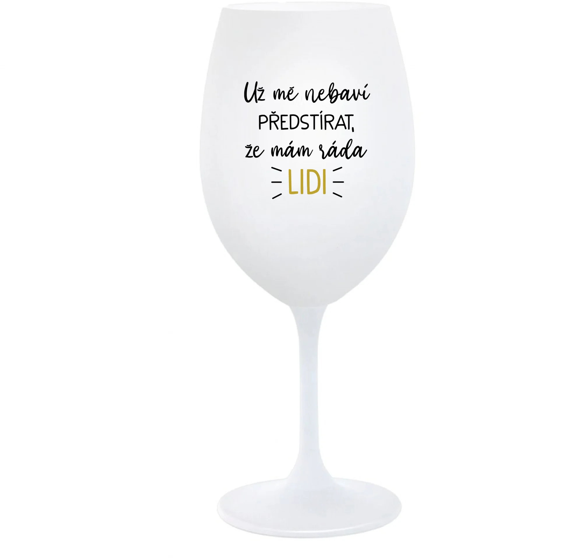 Vinná bílá sklenice s originálním motivem UŽ MĚ NEBAVÍ PŘEDSTÍRAT, ŽE MÁM RÁDA LIDI je krásným a osobitým dárkem, které ale využijete i Vy sami třeba ve chvílích, kdy si budete chtít zpříjemnit náročný den. Tyto originální vinné sklenice jsou totiž nejen pro výjimečné události, ale i pro běžné večery, které si chcete zpříjemnit sklenkou dobrého vína. Jistě proto potěší každého milovníka vína, i toho, kdo si umí svůj život vychutnat plnými doušky.