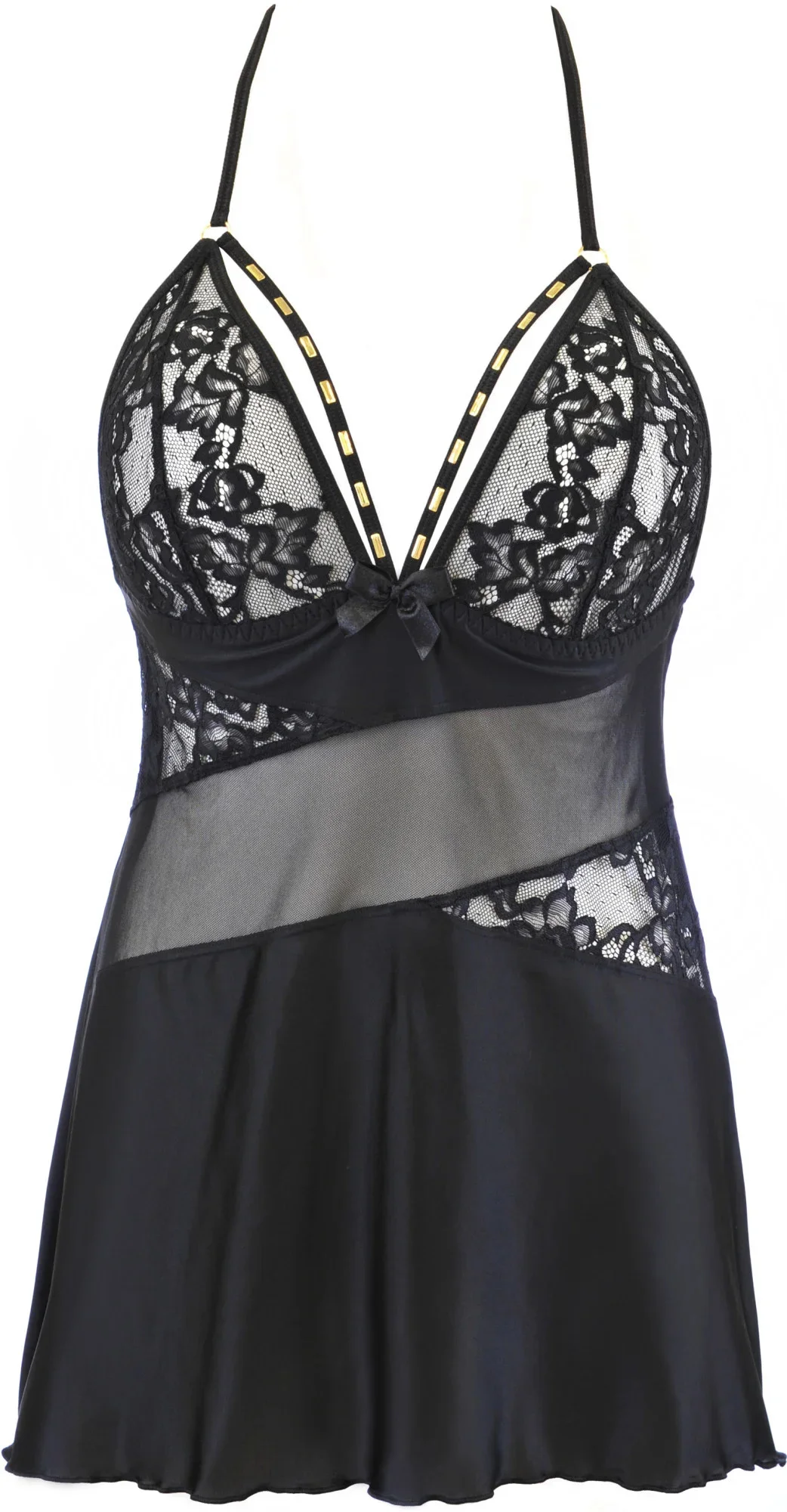 Objevte svou dravost v naší efektní černé košilce s bohatě zdobenými proužky ve výstřihu. Každá má doplňky ve zlaté barvě, které zvýrazní vaše tělo. Celek je vyroben z velmi jemného a pružného mikrovlákna, s krajkovými vsadkami. Obvod kolem prsou na odpovídajícím pásku, ramínka se vzadu kříží, nejsou odepínací, ale nastavitelná. Ke každé naší košilce přidáváme zdarma kalhotky, elastické, ze stejného materiálu, zdobené ornamentem ve zlaté barvě. Materiálové složení: Polyamid 82 %, Elastan 17 %, Bavlna 1 %