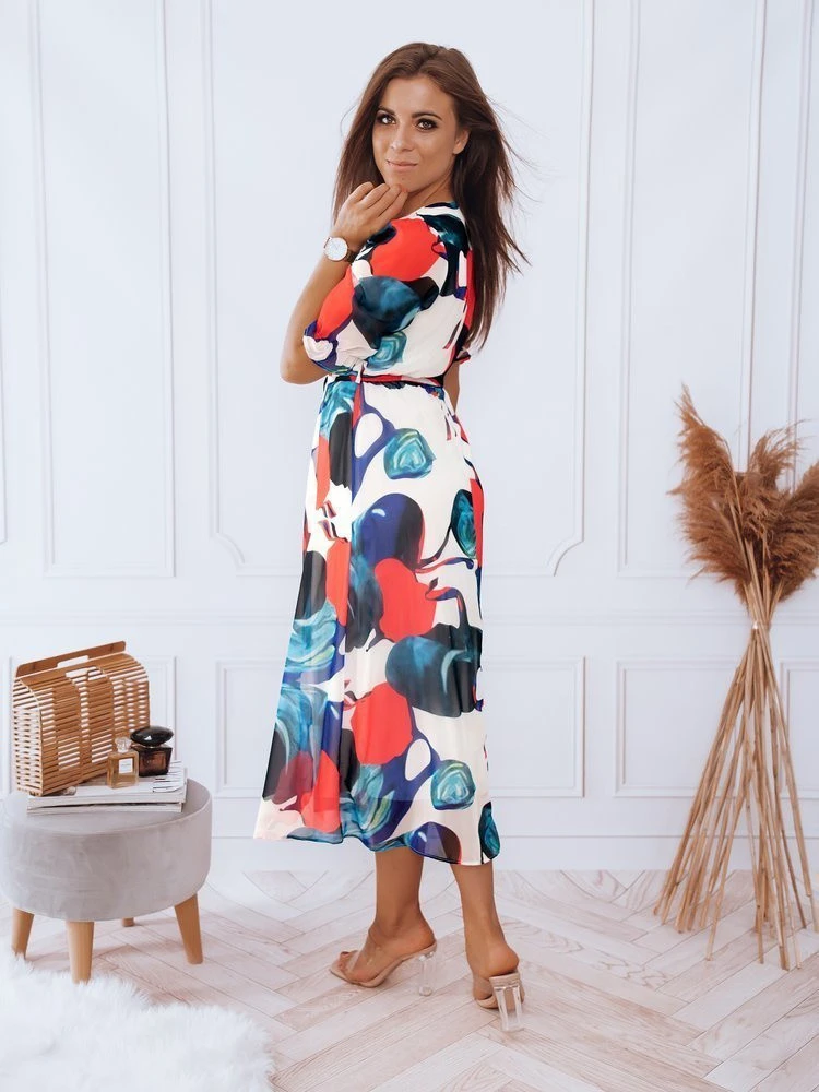 Nádherné a fenomenální - tato slova dokonale vystihují šaty VALLERIO. Jedinečný potisk je ideální jak pro velké výlety, tak pro každodenní nošení. Model má výstřih do V a podšívku, elastický pas a vázačky pro zvýraznění pasu. Krásný materiál, který musíte mít!