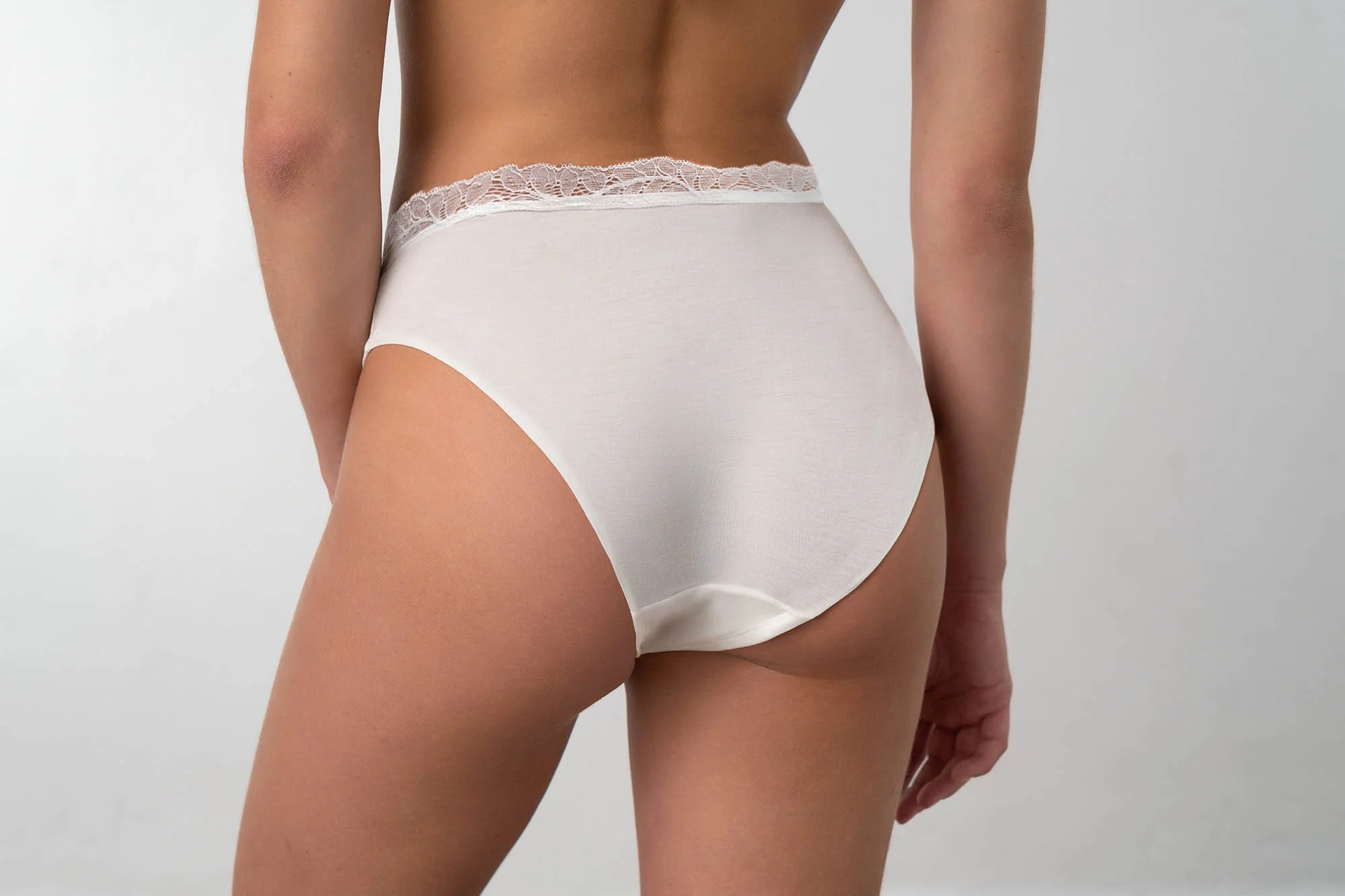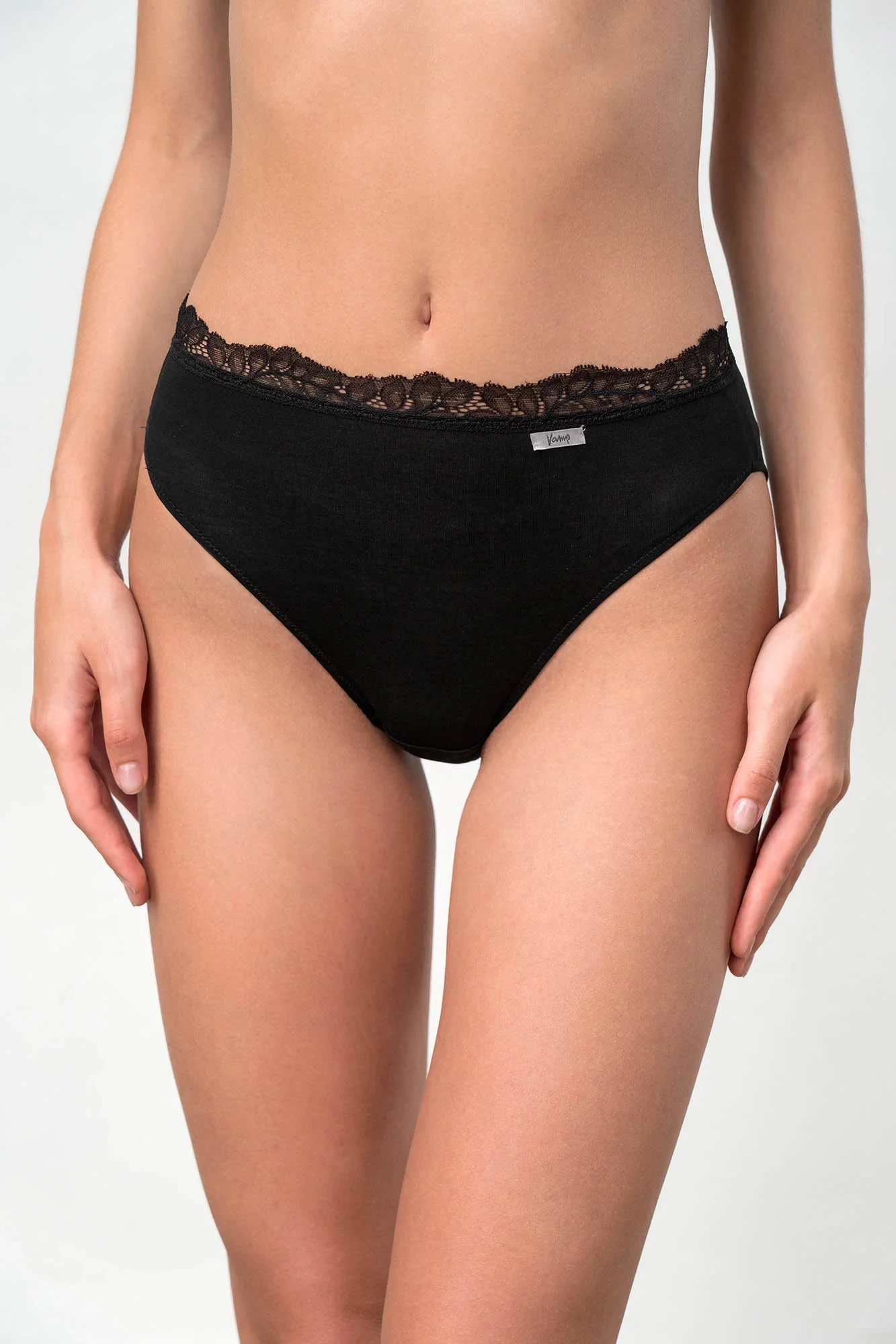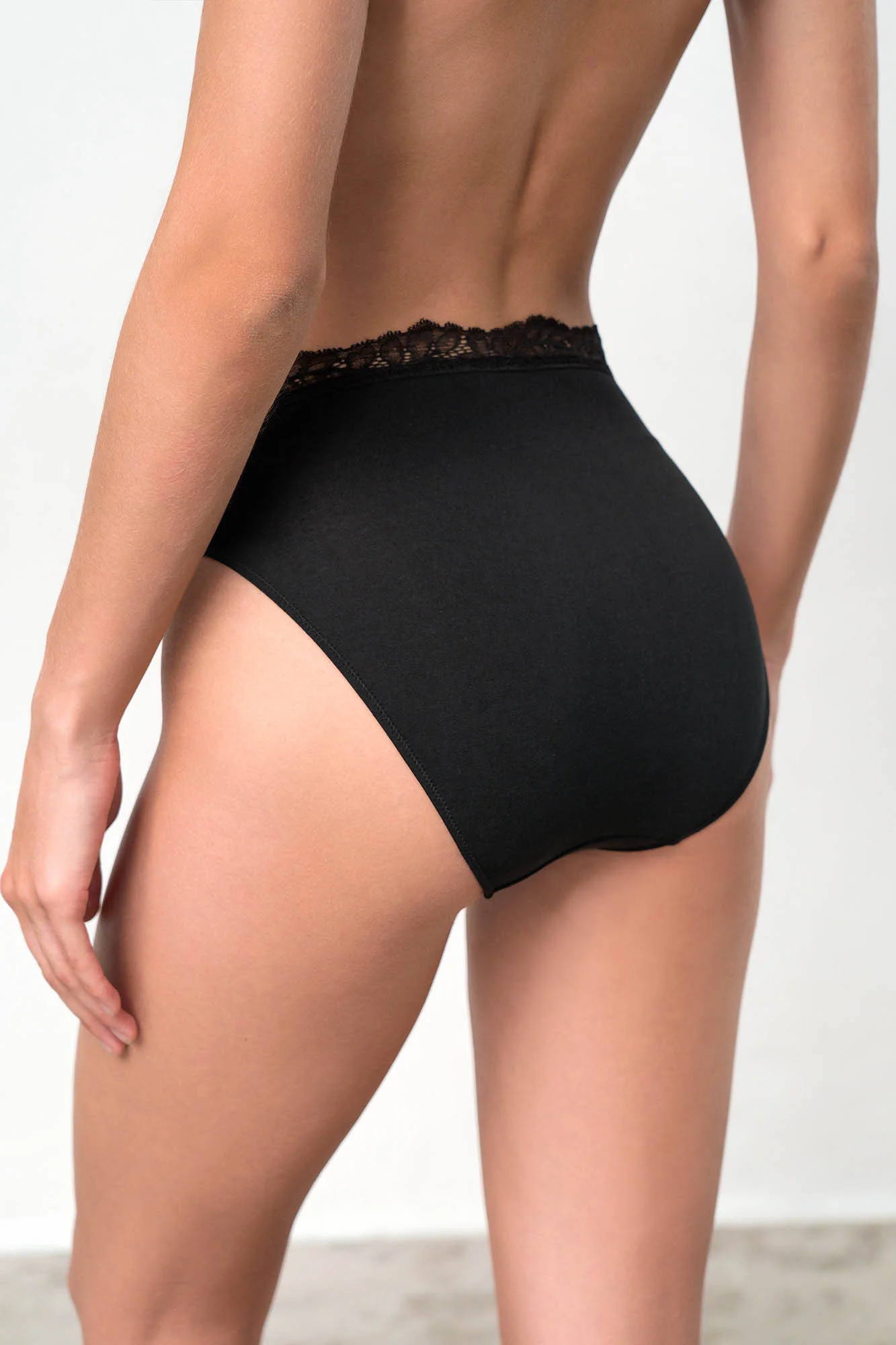 - střih: brief, vysoký pas, horní část kalhotek lemována krajkou