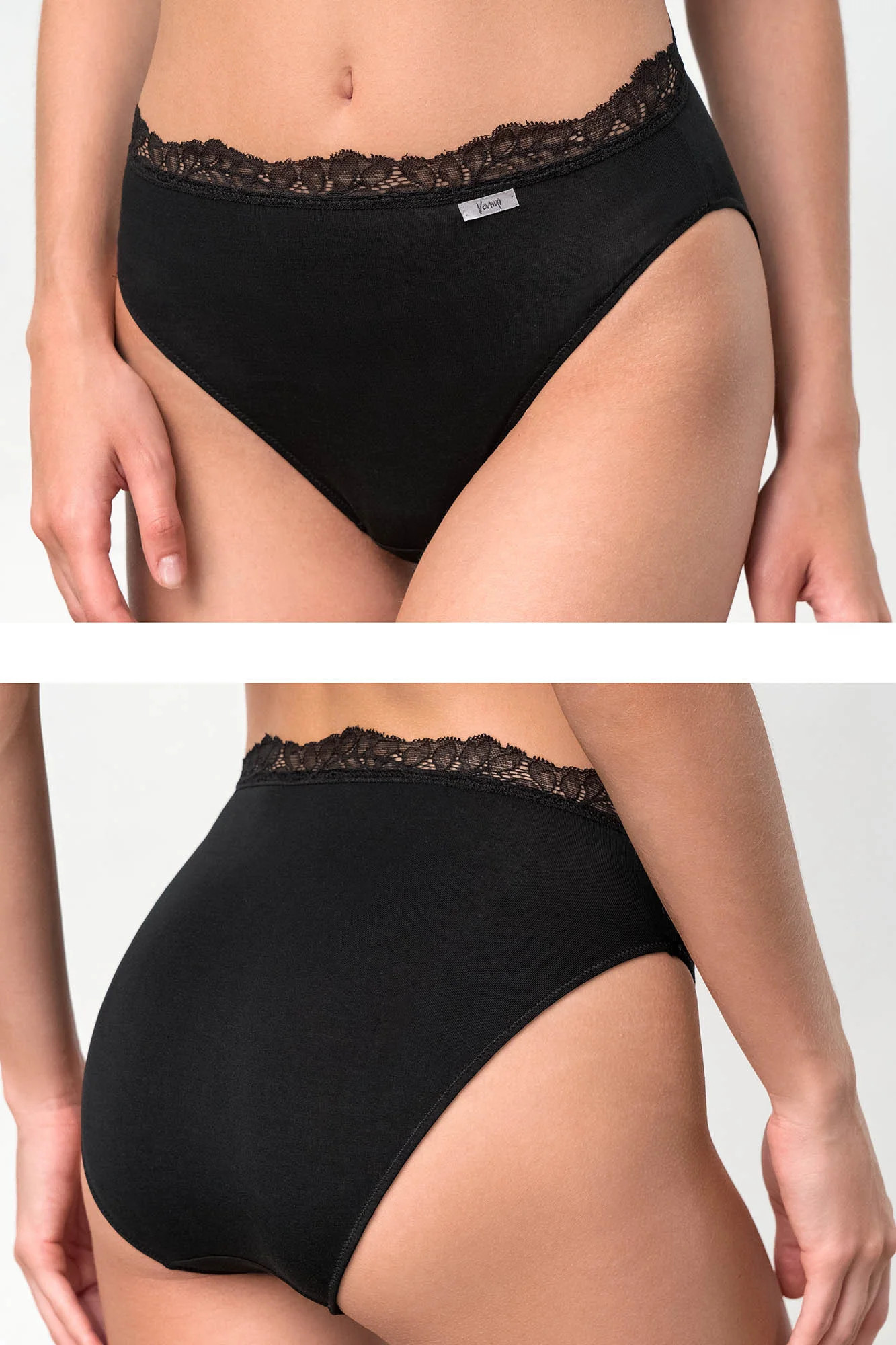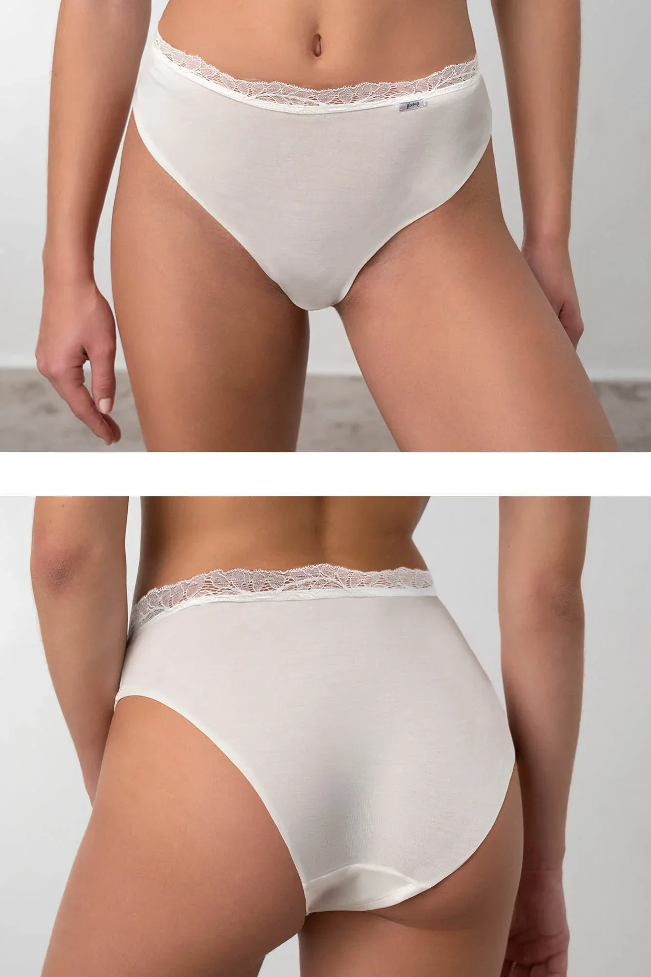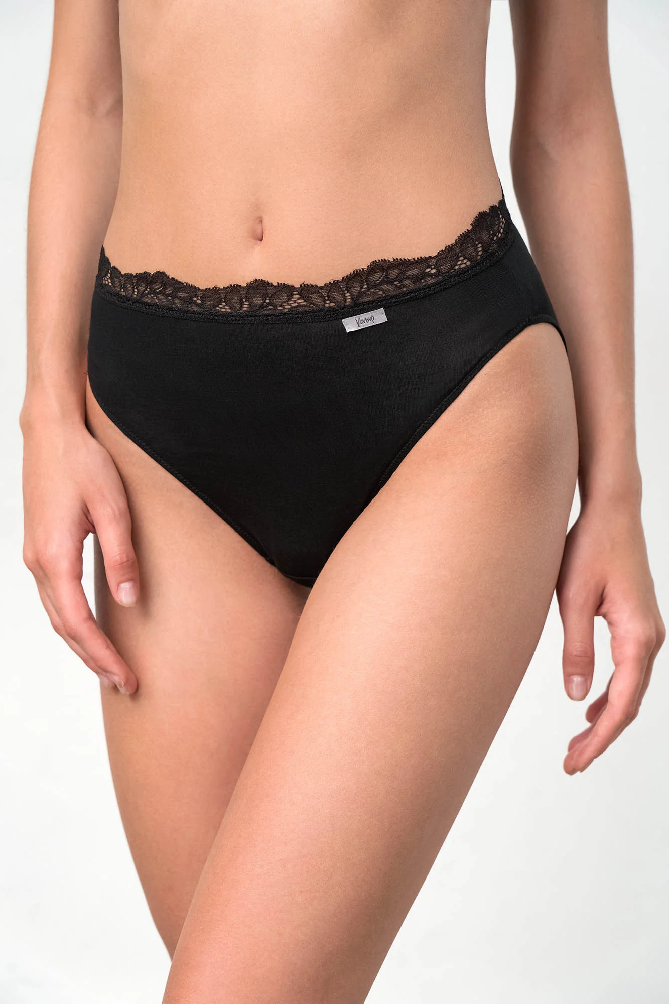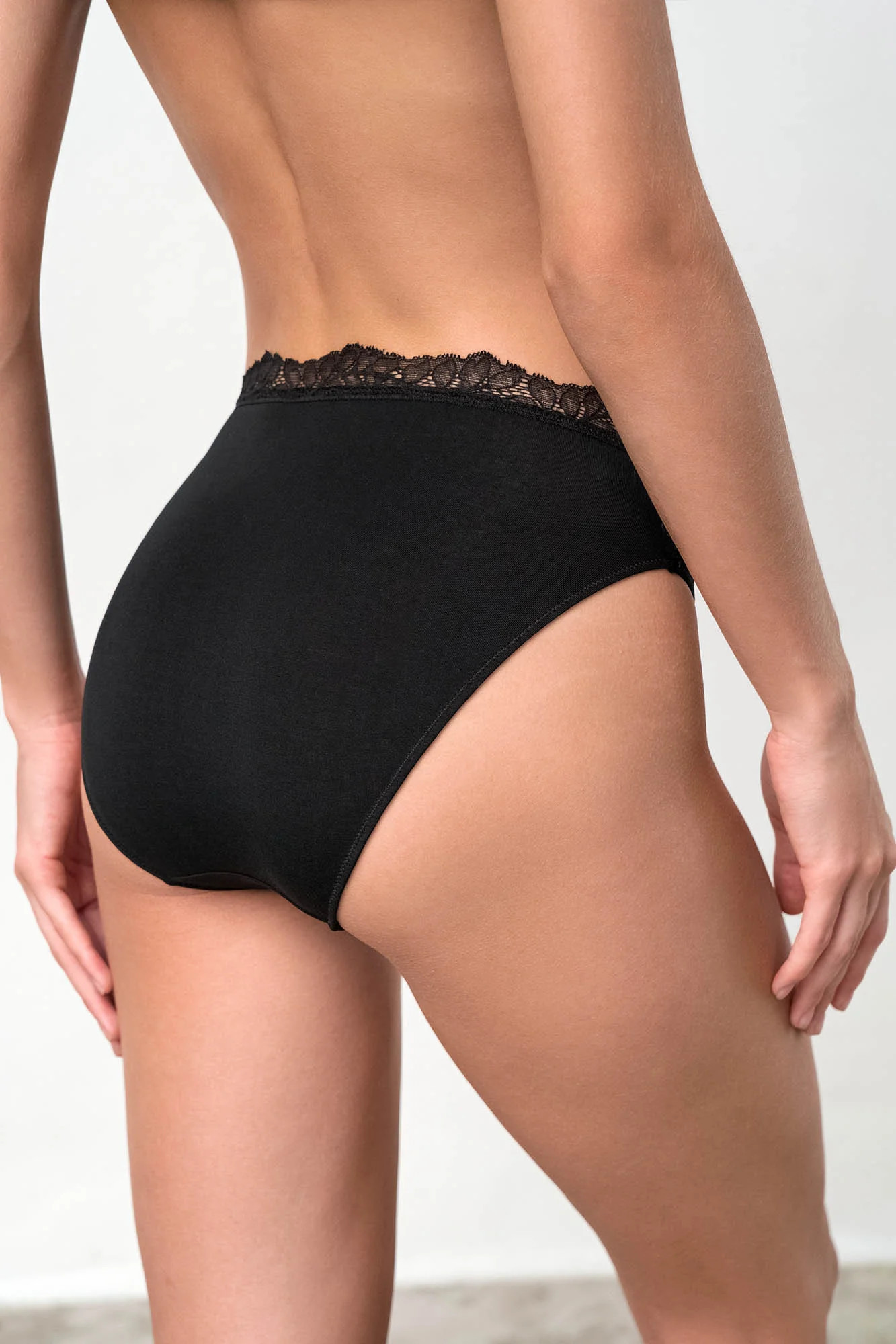 - střih: brief, vysoký pas, horní část kalhotek lemována krajkou